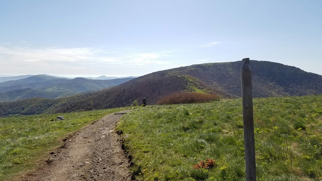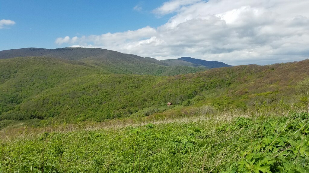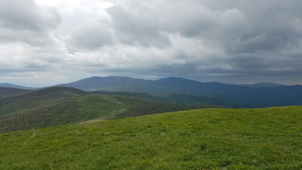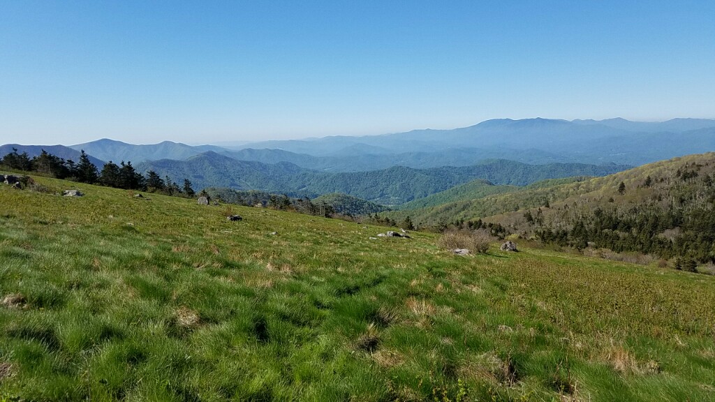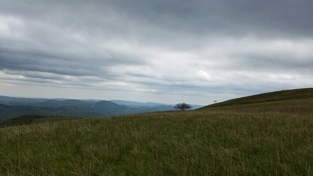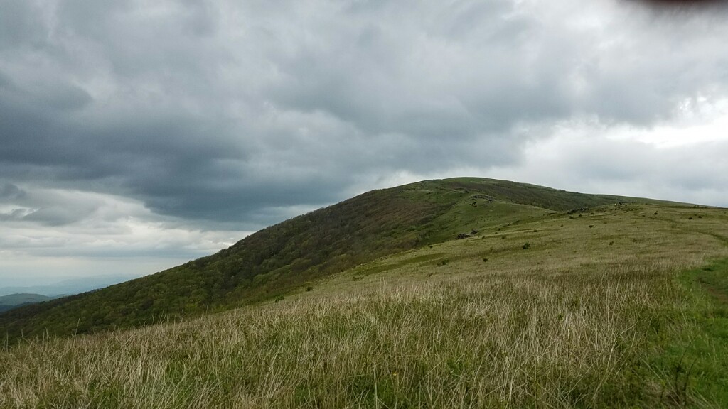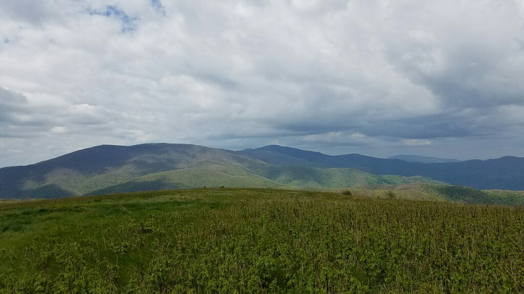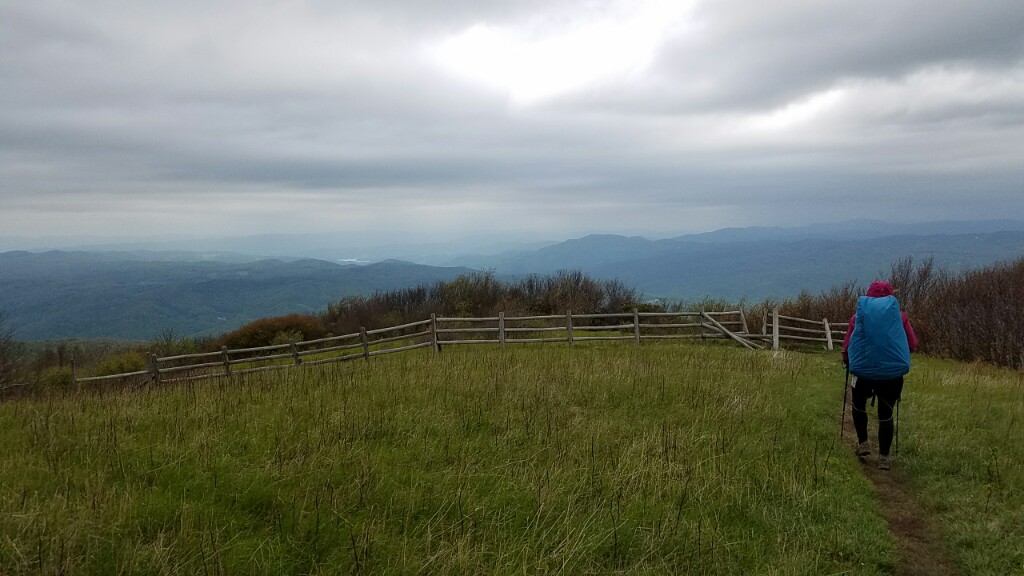 The morning was cold and windy too, but very nice. Once we lost some elevation, and the wind died down a bit, it was very pleasant. After descending from Roan High Knob, we spent most of the day hiking up and down wide open grassy balds with excellent views. In some of today’s photos you’ll see a barn in a valley. This is actually a converted barn that’s now a shelter for hikers. We would have visited, but it’s about .3 miles off the trail, and that’s distance we didn’t want to add.