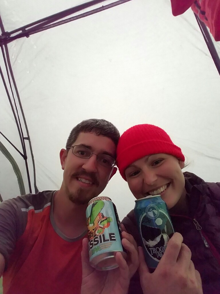 We didn’t really even eat a real dinner tonight. We inhaled some trail mix and cheese and crackers, and we also drank the two beers we packed in (greatest decision). We’re now warm and dry in our tent, and hoping for some sun in the next few days.
