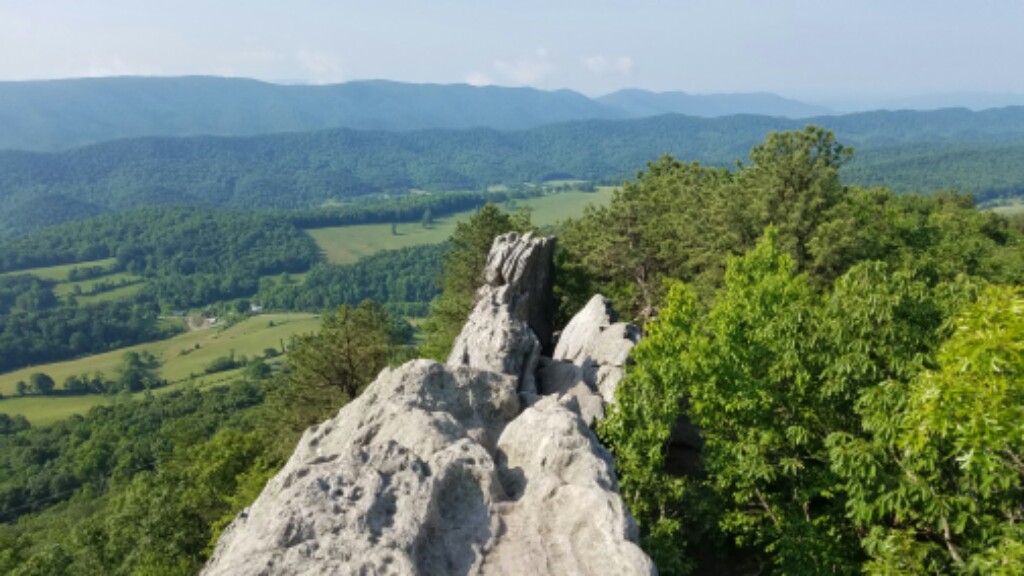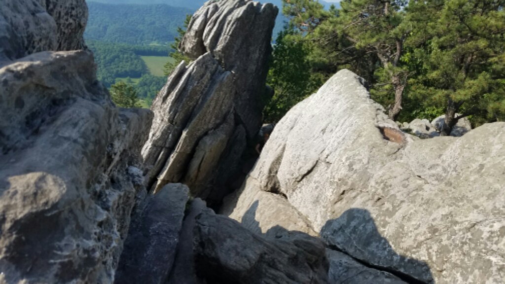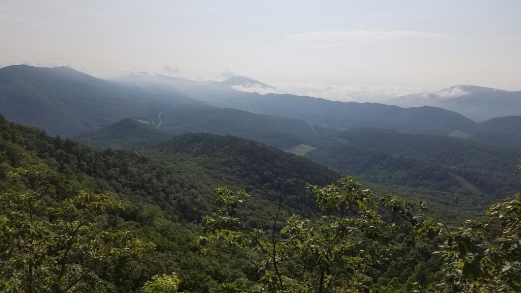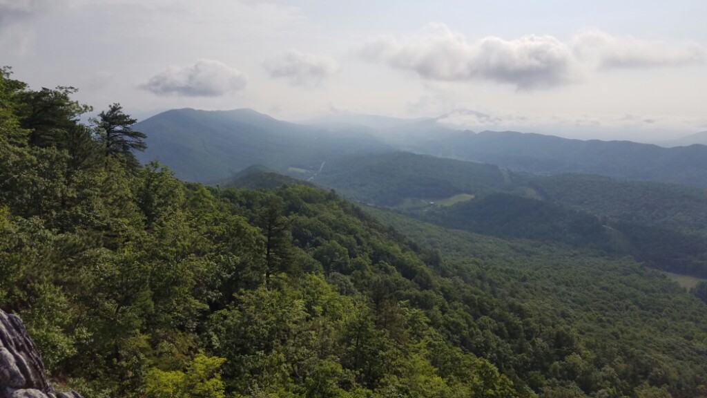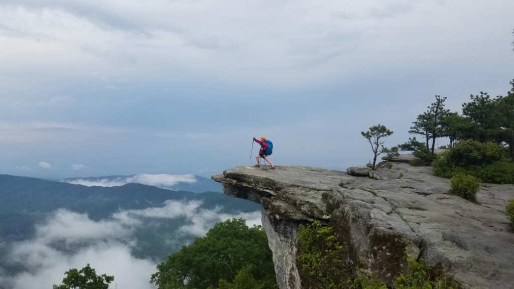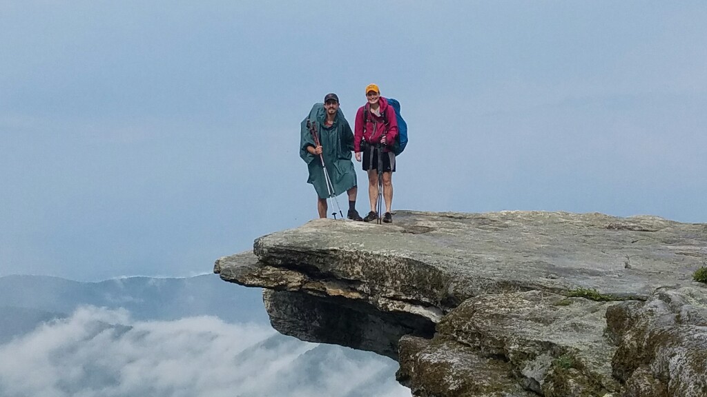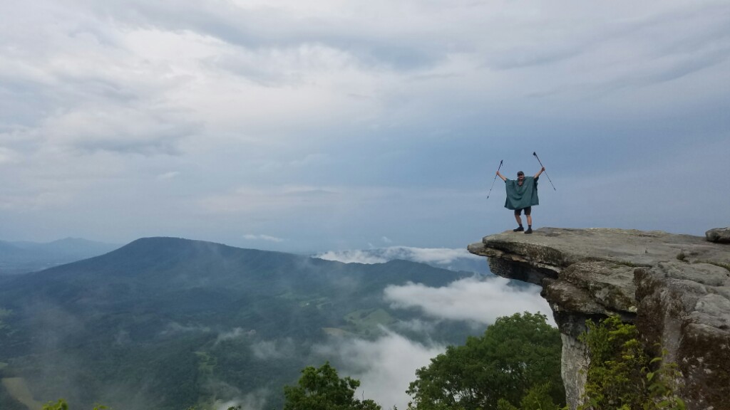 The rain picked up in intensity almost immediately after we left the shelter. Any amount of drying that my feet and shorts began was negated. We hiked the fastest 2.7 miles to the top of McAfee Knob the I think we’ve hiked yet. And we lucked out. As we approached the top, the rain slowed, then stopped. The sun didn’t come out, but we were afforded the amazing views that McAfee Knob is known for. It’s one of those famous landmarks on the Appalachian Trail.