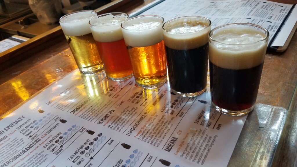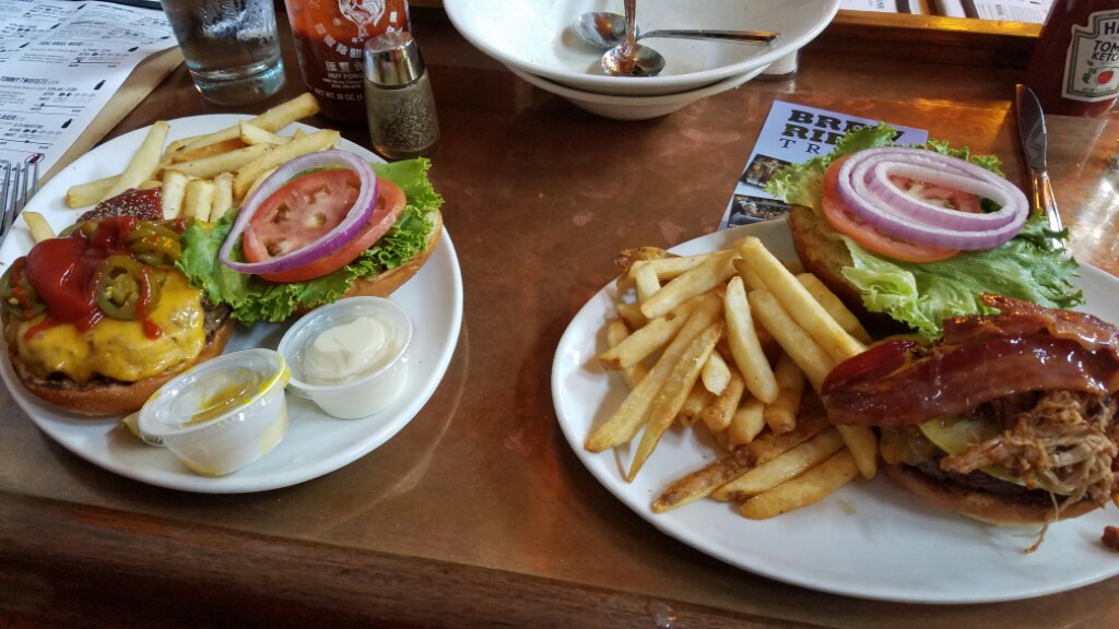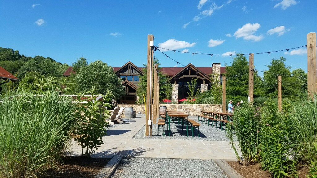 The rest of the day was spent at Devil’s Backbone brewery Basecamp, and it was awesome. When you get there, it’s like a big compound dedicated to beer. There’s the main building where the brewery, tap room, and restaurant are all located, then there’s a big outdoor area with another bar, a hut to get food, an amphitheater, a fire pit, and lots of chairs all over the place to sit, relax, and enjoy your beer. There’s also another building that looks like it’s for special events. We arrived a bit after 1:30, and our first order of business was to get some lunch. We began with a big salad, and of course some beers. Bear Bell got a tasty Raspberry Sour beer, and I got a flight of their year round beers, followed by a second flight of some of their more interesting offerings like the 16 point imperial IPA. We both ordered burgers for lunch. Mine had pulled pork and bacon on it. Everything was great.