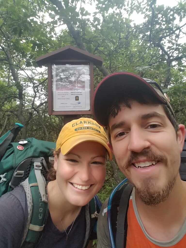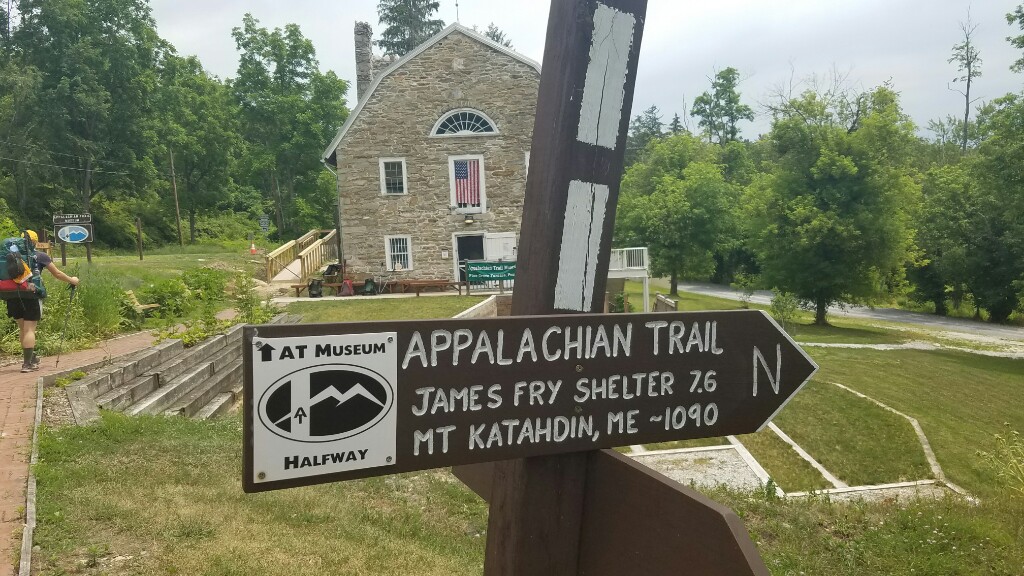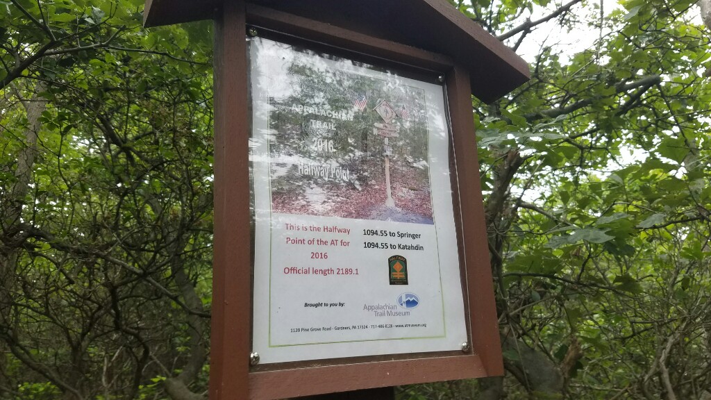 We didn’t have to travel far this morning to hit a major trail milestone… the official halfway point between Georgia and Maine. That means at that that point we’d walked 1094.55 miles from Springer mountain, and we’ve got exactly that many miles to Kathadin. Of course we didn’t stop there for the day, that was only 3 miles in for the day… we had to make it down to Pine Grove Furnace State Park and get some ice cream.