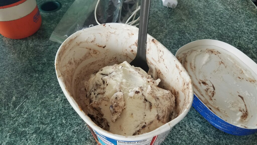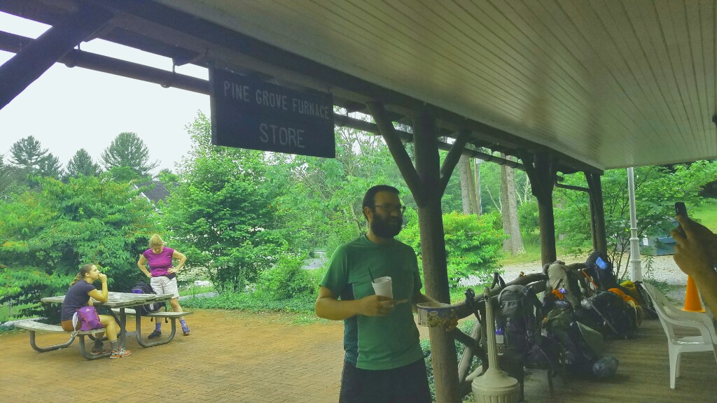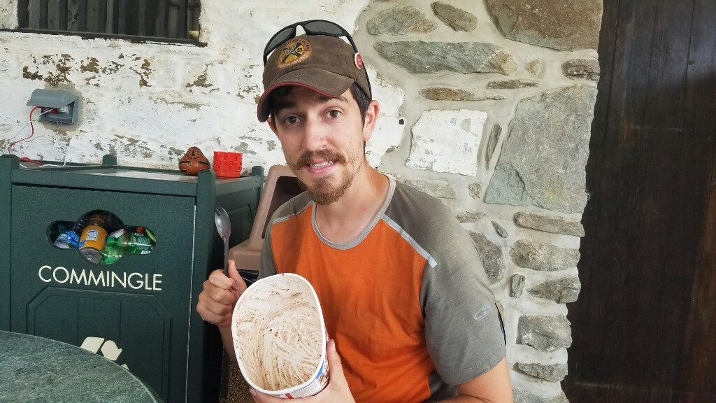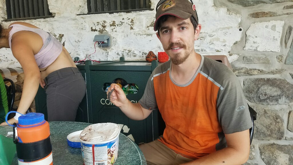 We reached Pine Grove Furnace State Park by 10:30 am, and there was already a good group of hikers there with their ice cream attempting the famous half gallon challenge. As promised, I’ll explain. The half gallon challenge is just as it sounds… the hiker eats a half gallon of ice cream. You don’t get a t-shirt, or your picture on the wall. You even have to pay for all the ice cream you eat. The only prize is bragging rights, and a small wooden spoon with the words “half gal club” printed on it. They’ve broken it up into two phases now. First you buy a 1.75 quart tub of ice cream. Once you finish that, you buy the final pint to complete the half gallon.
