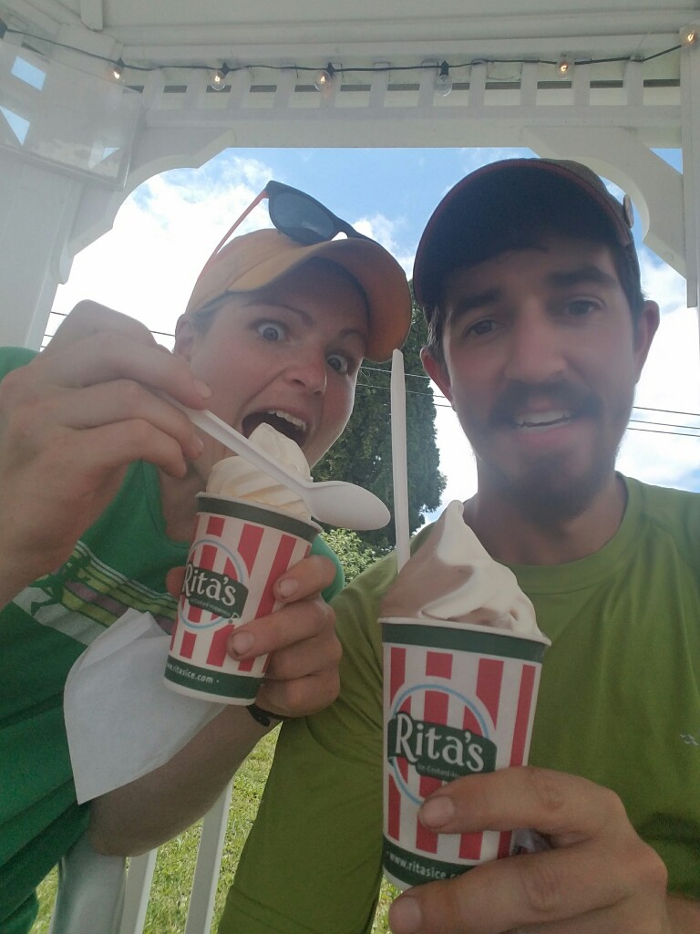 After eating, we were still a bit hungry so we wandered another mile south into town and stopped by Rita’s Water Ice. For those of you who aren’t familiar with Rita’s, it’s basically a slushy with soft serve ice cream served on top. I know it sounds a bit odd, but it’s really good. We relaxed in their gazebo and slowly enjoyed our cold treats. It was pretty warm out, so they tasted extra good.