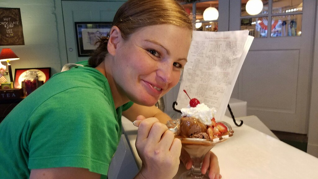 Next we went down to the little ice cream shop (or rather shoppe). It’s run like an old timey soda fountain. They make shakes, sundaes, and sodas with the syrup and soda water coming out of old fashioned taps. We offer course got some ice cream, and a hot dog and soda.