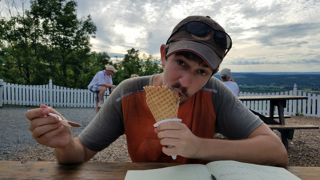 The next 4 miles or so were really difficult. Lots of rock scrambles, quick up and downs, climbing with our hands… all things that slow us down. We were already getting tired at this point in the day, and that terrain was just accelerating the feeling. A bit after 6pm we finally made it to the NY 17A road crossing, where we walked an extra .2 miles west, and rewarded ourselves with a visit to the Bellvale Farm Creamery. The ice cream they make there is so good, and they even make their own sodas. The place was packed, which reassured me that the ice cream is probably still good even if you didn’t hike 21 miles to get it. We relaxed for a bit and took in some of the nice view that they have from their lawn before heading back out.