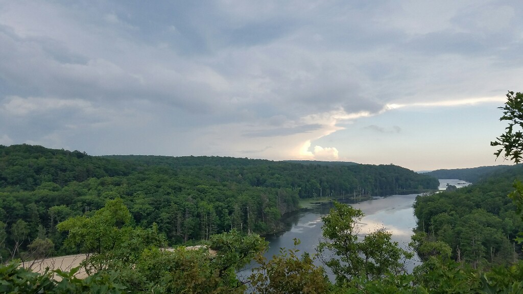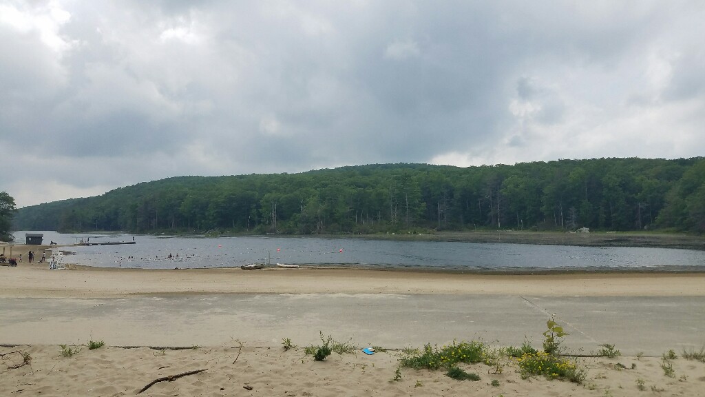 We stopped for a bit after about 3 hours of hiking and had a little snack, and there was a spigot in a parking lot with potable water that we could refill at. That was nice not having to filter water. A few miles later, we hiked an extra quarter mile off trail to go to Canopus Lake beach. That was the turning point for the day. Even though it was humid, we jumped in the lake to cool off. We were joined by several other thru-hikers, Barnum, Scorpion, and Shepard. We were able to grab a bit of food and cold drinks from the concession stand, and the sun even came out so we could dry out our rainfly.