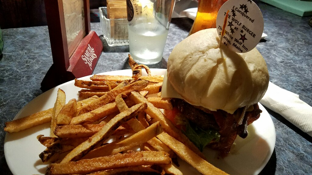 We ate at the White Wolf Inn and each had the Wolf Burger… and 8oz beef patty topped with sausage, bacon, cheese, mushrooms, onion, lettuce, and tomatoes, and served with fries. We both easily finished the burgers and had room for dessert. I had the khalua icebox cake and Bear Bell had the apple crisp a la mode.