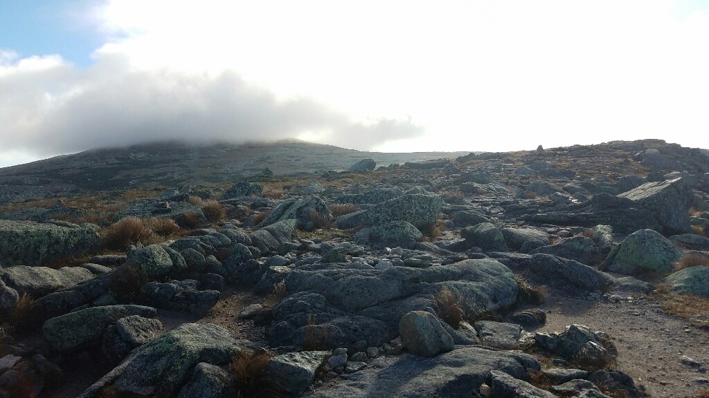 When the steep part of the climb ended we were about 1.5 miles to the summit. This last section is called the Tablelands because it is a wide, flat, open space near the top of the mountain. The trail ascends to the summit more gradually here, only getting steep one last time just before hitting the peak. It still wasn’t super fast going though. The Tablelands section was covered in rocks that needed to be navigated, and it was still very cold and windy. We were still pretty lucky with the weather though, and we had some of the most incredible views of the entire trip as we climbed up to the Tablelands and walked across them. Only the very top of the mountain was shrouded in some clinging clouds.