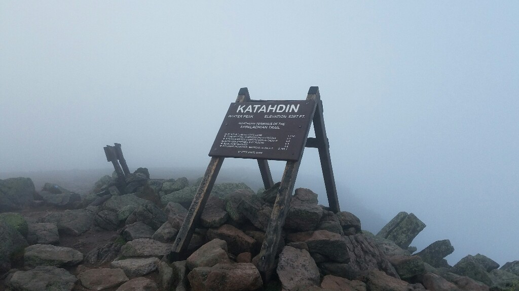As we headed up the final climb we entered the clouds. At one point Bear Bell turned around to show me that she had just bent her hiking pole. She had slipped and caught herself with it. It was a bit poetic that it happened right at the end of our journey. As we were up in the clouds wet couldn’t see the summit, so we weren’t really sure how much further we had to go. With the wind still whipping by us, we both thought that we still must have about a half mile to climb. As we took a few more steps into the mist of the cloud, we saw a sign materialize… there was the summit. We walked the last 100 yards of the trail side-by-side to officially become thru-hikers together.