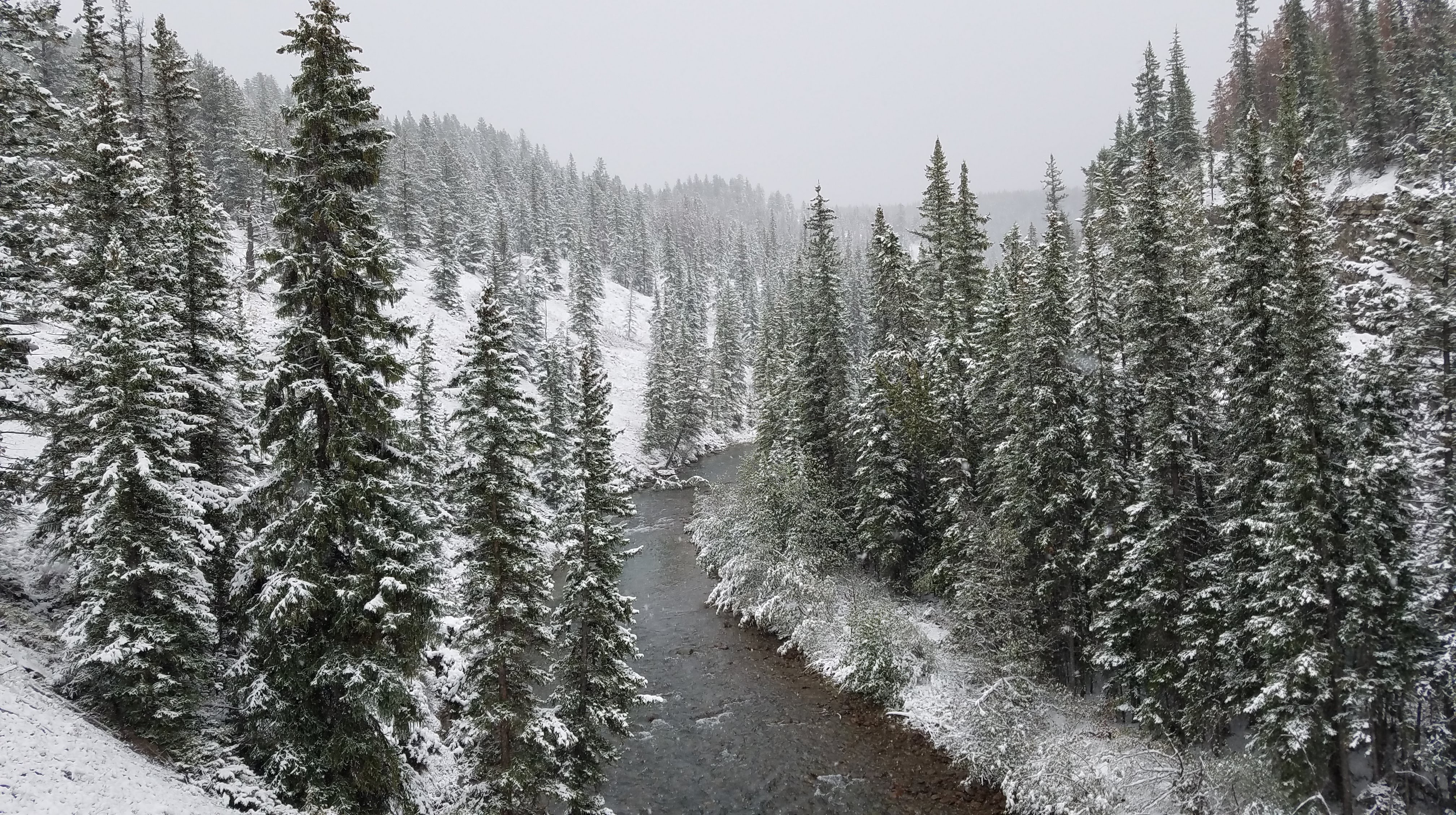 From Sunwapta Falls we didn’t have any other stops planned, so we just headed the final 61 miles south to Saskatchewan River Crossing where we were spending the night. On the way there we passed by the Icefield Discovery Center again, and noted how different everything looked with a coating of snow. We also ran into some unexpected traffic on a bridge. As we creeped up, wondering what could be causing the delay, we soon realized it wasn’t a human reason. A group of female bighorn sheep were essentially blocking one lane of traffic on the bridge licking the salt off the road… and the fact that people were slowing down to take pictures didn’t help the traffic.