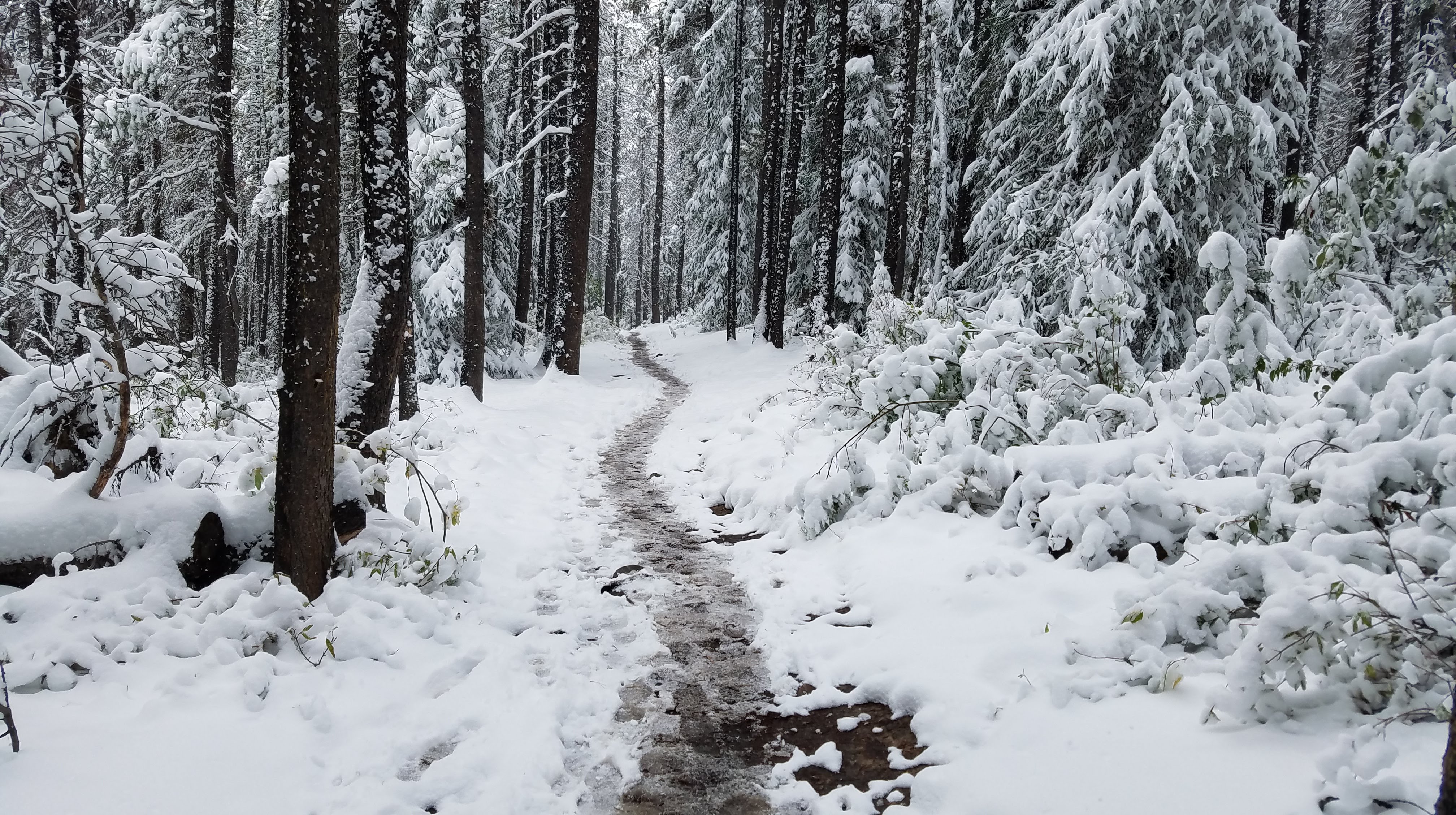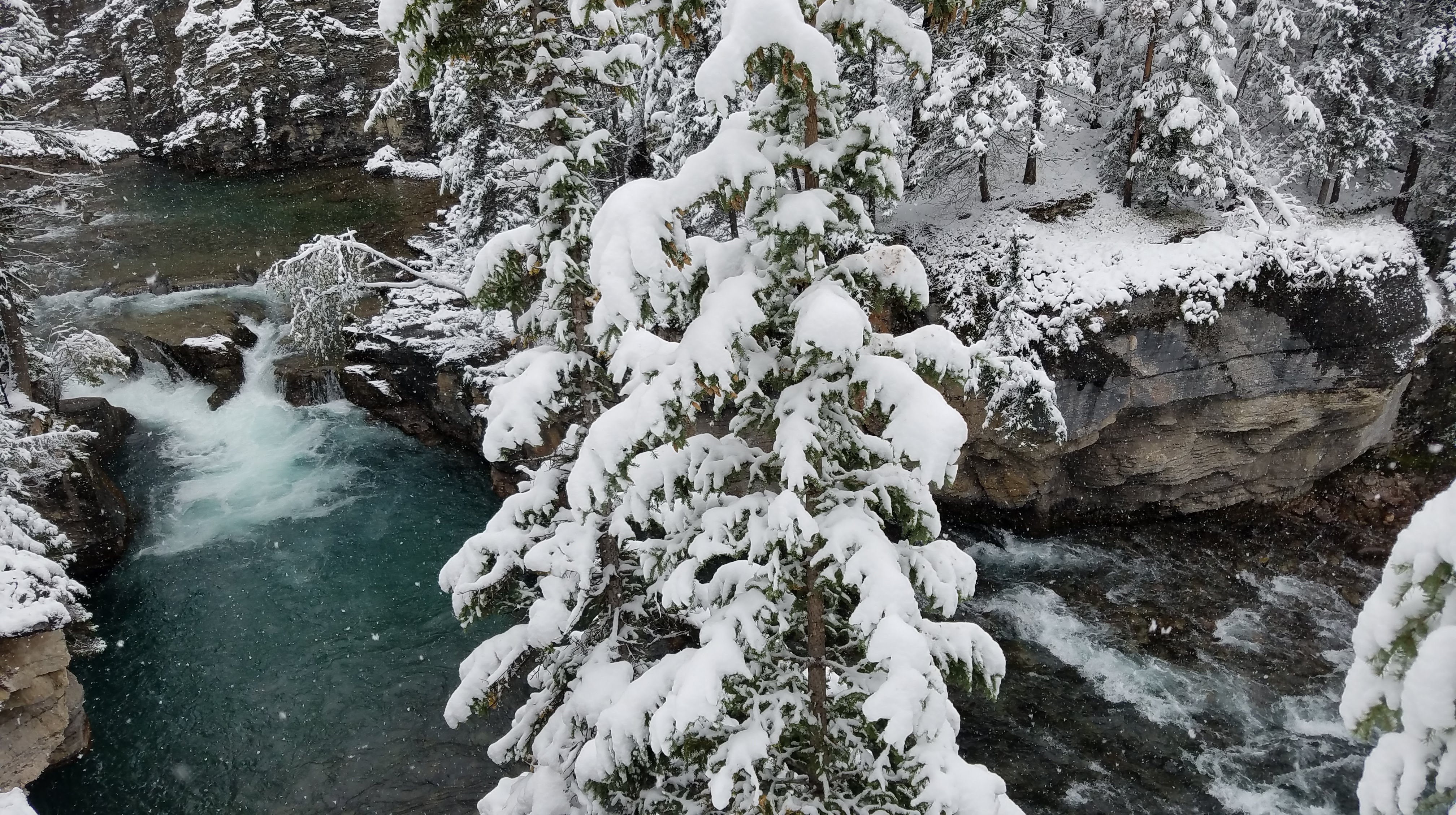 We checked out of the Fairmont and drove only a short 4 miles to the Fifth Bridge trail head for the Maligne Canyon trail system. the Maligne Canyon is a narrow canyon just east of downtown Jasper, and is the deepest canyon in the Rockies. We were the first to the trailhead on that cold, snowy morning. We crossed the trail head’s namesake bridge, and started out walk upstream along the river.