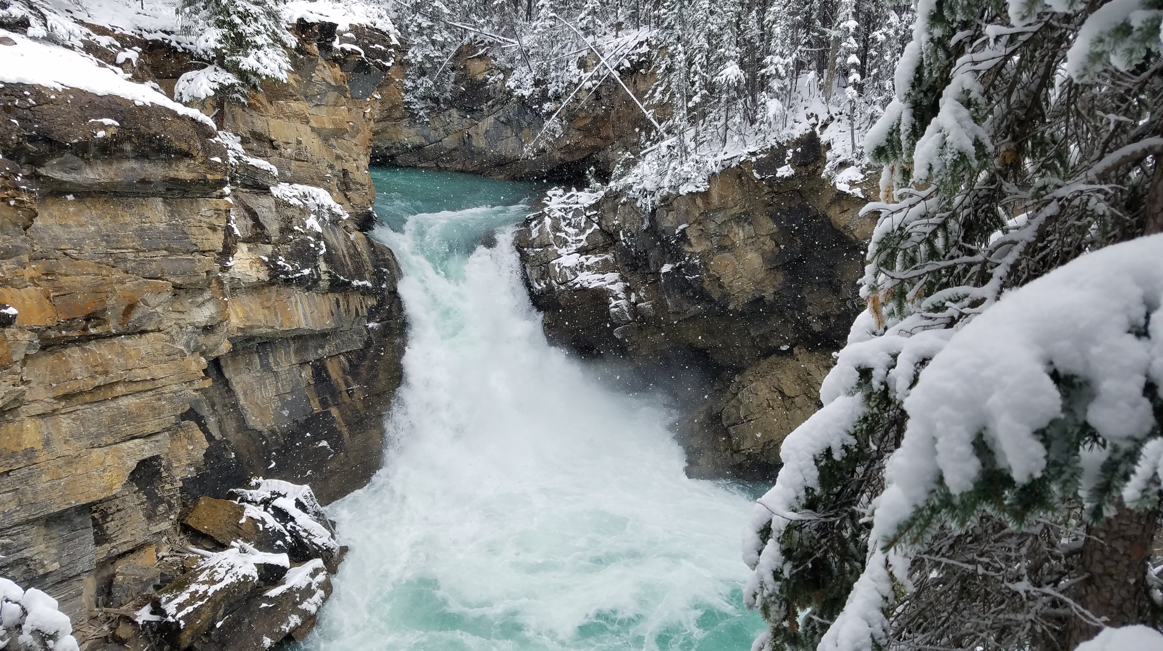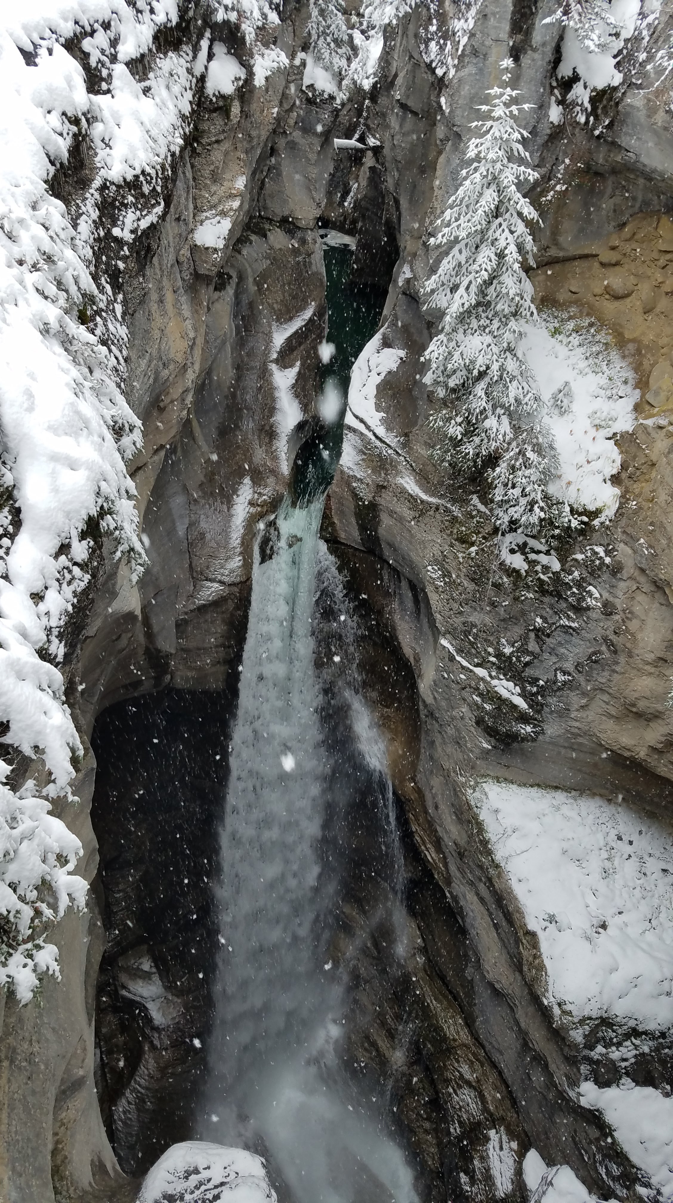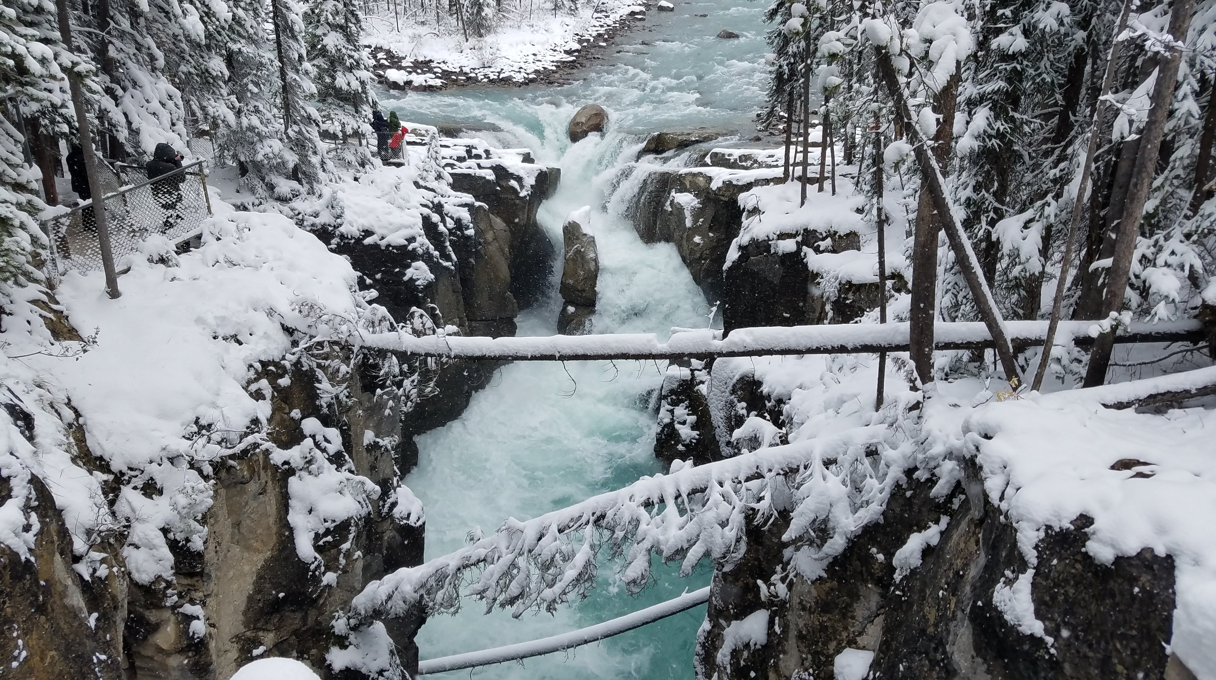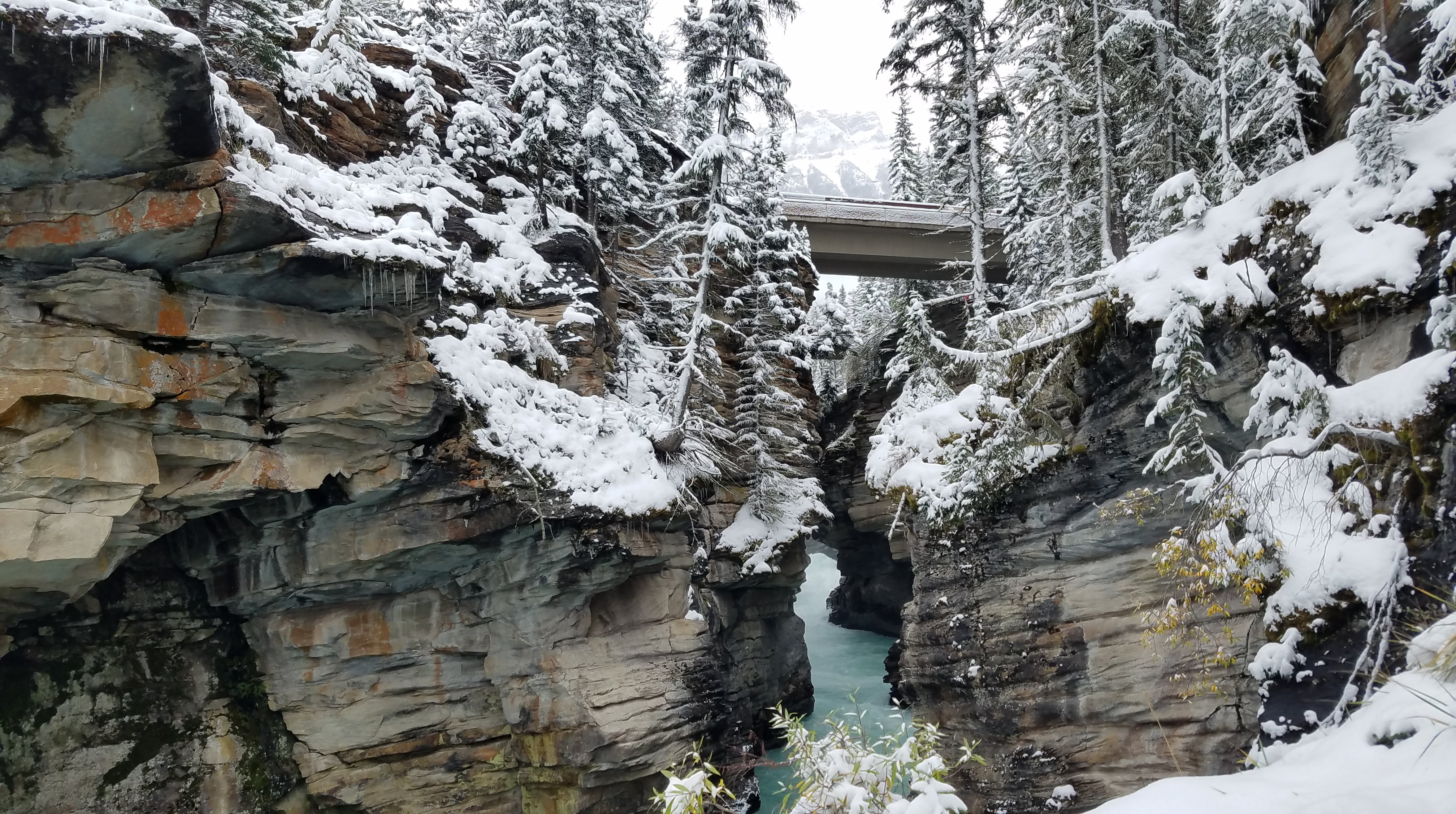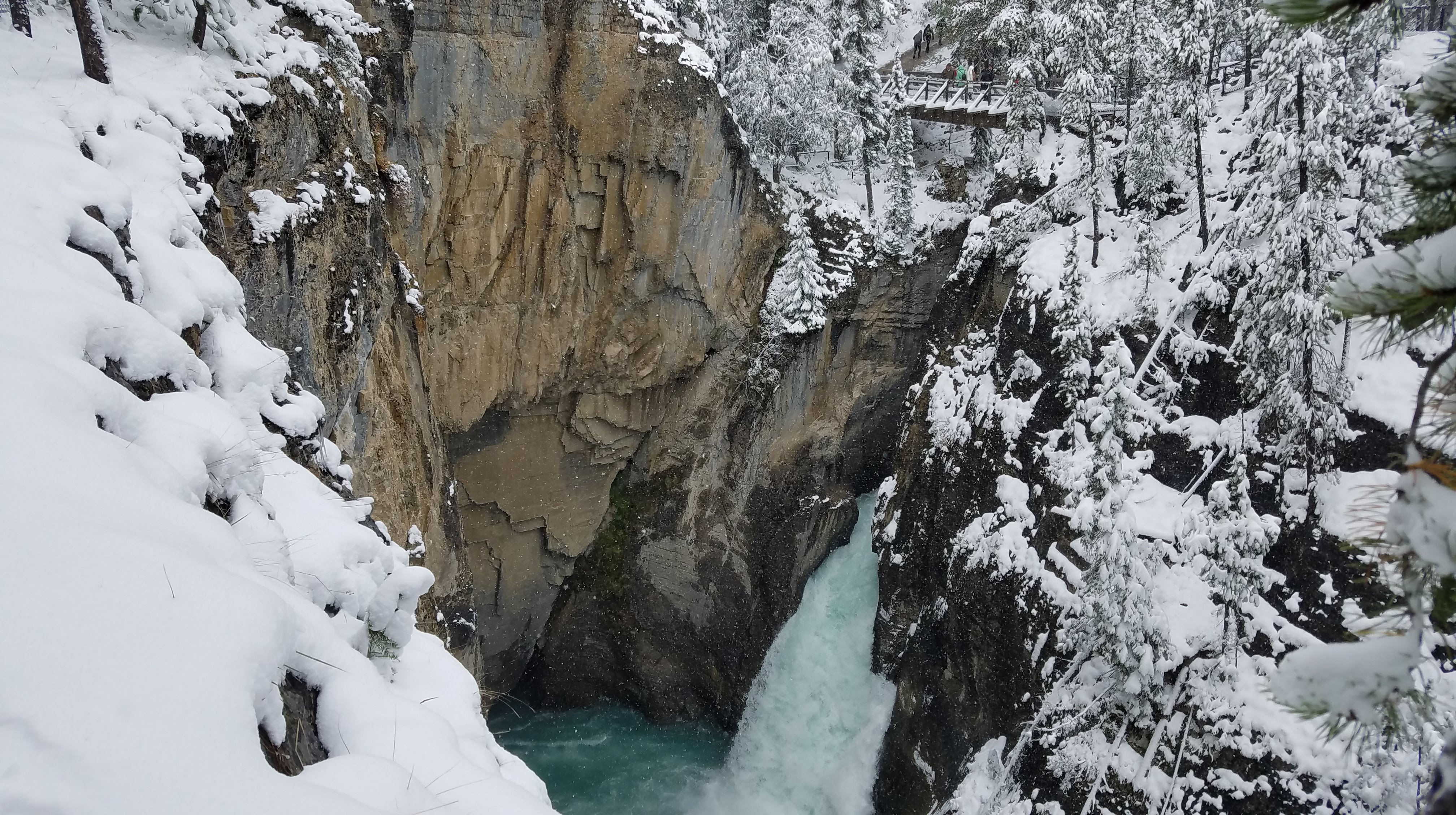 We had a really nice hike up the river toward the Maligne Canyon Visitor Center and Restaurant. We’d recommend doing the hike upstream like we did, as most of the crowds will begin at the large parking lot upstream, just so they don’t have to walk as far to get to the more impressive parts of the canyon. As we made our way along the river, the walls of the canyon started getting taller, and before we knew it, we were crossing bridges over waterfalls that were tumbling almost 160 feet down below us. The snow made for some slippery portions of the walk… especially the portions of the trail that were paved. As we got closer to the restaurant, we ran into more and more people, until we finally made it all the way to First Bridge, and we could see tour busses of people unloading to see the canyon.