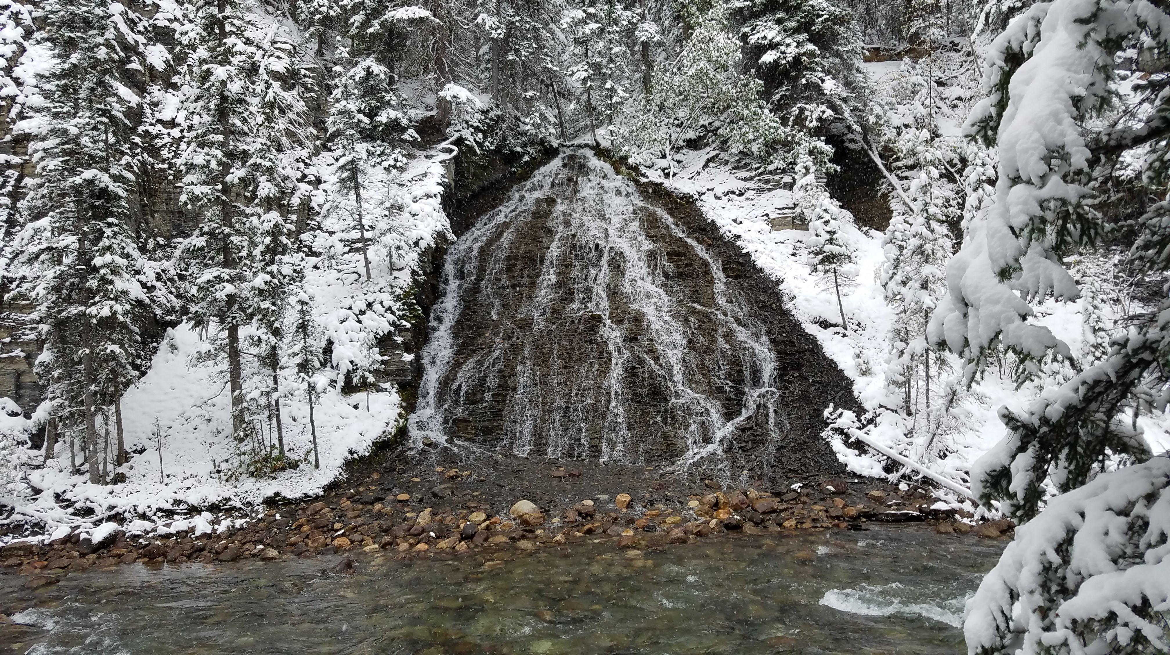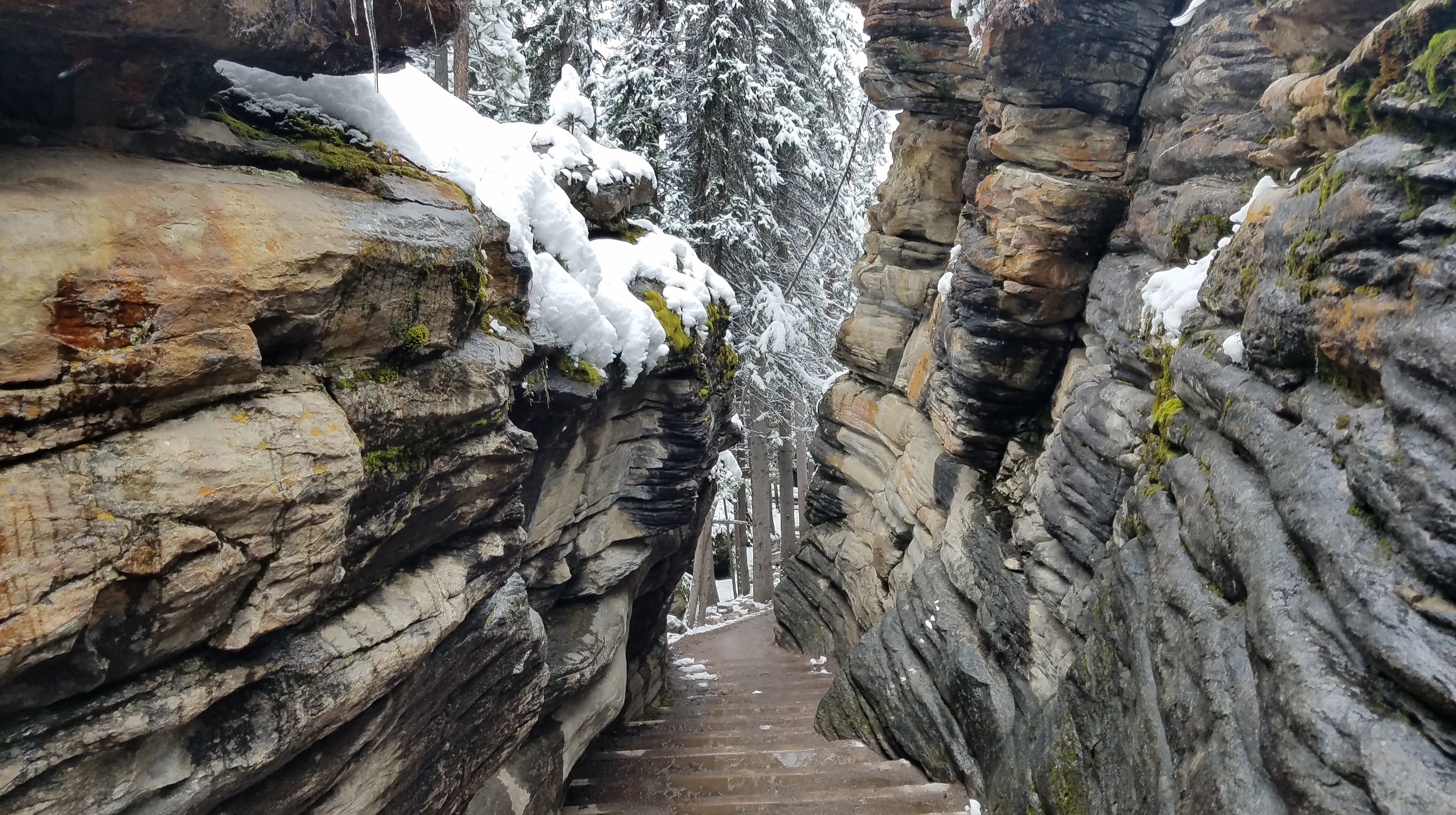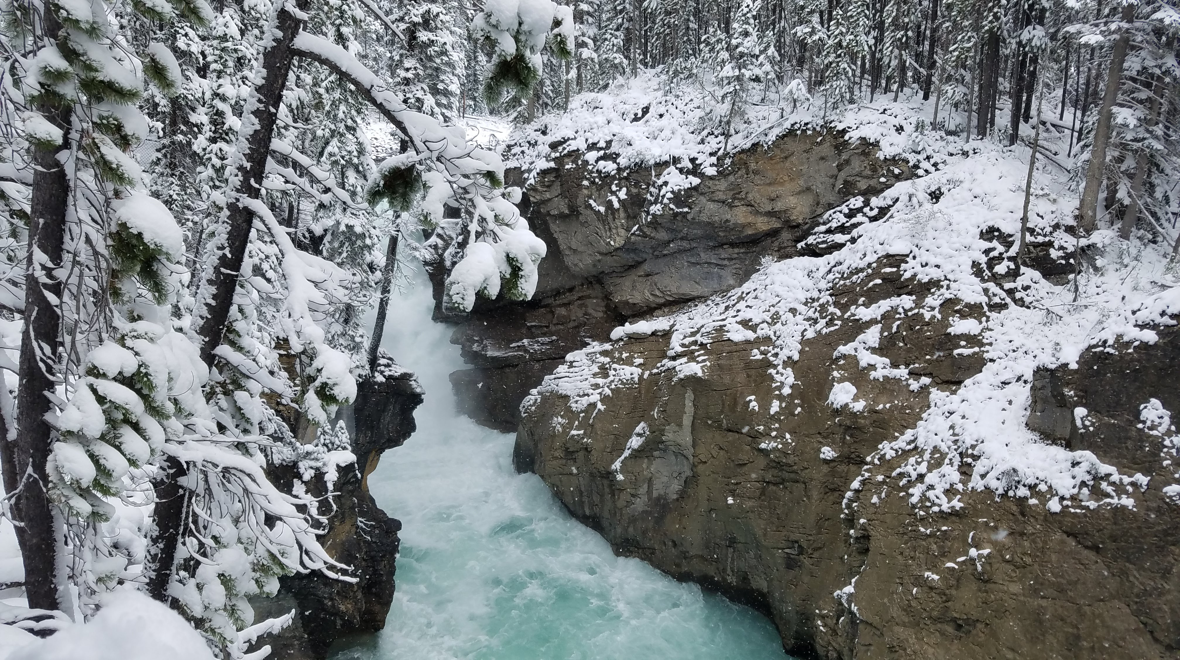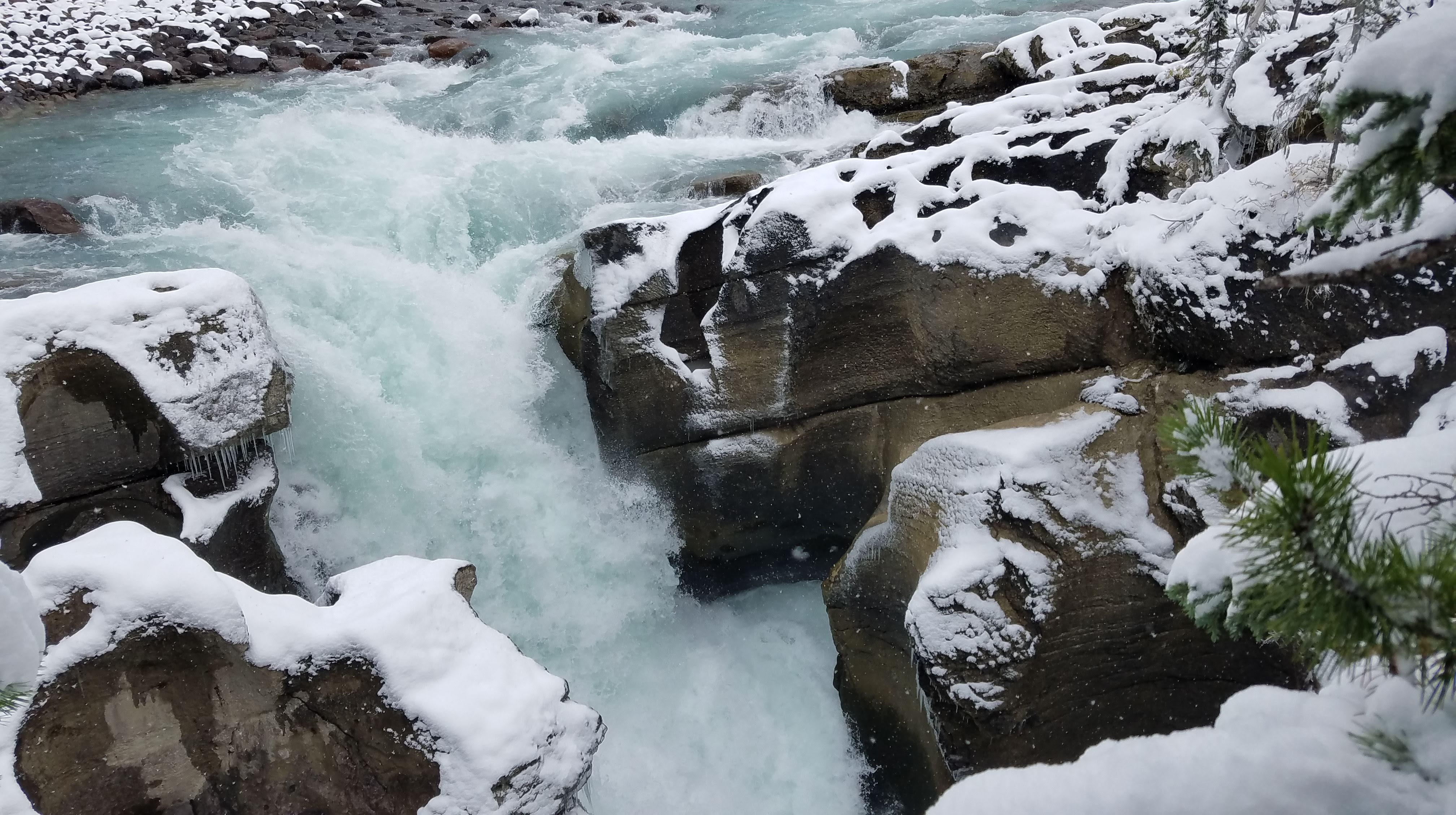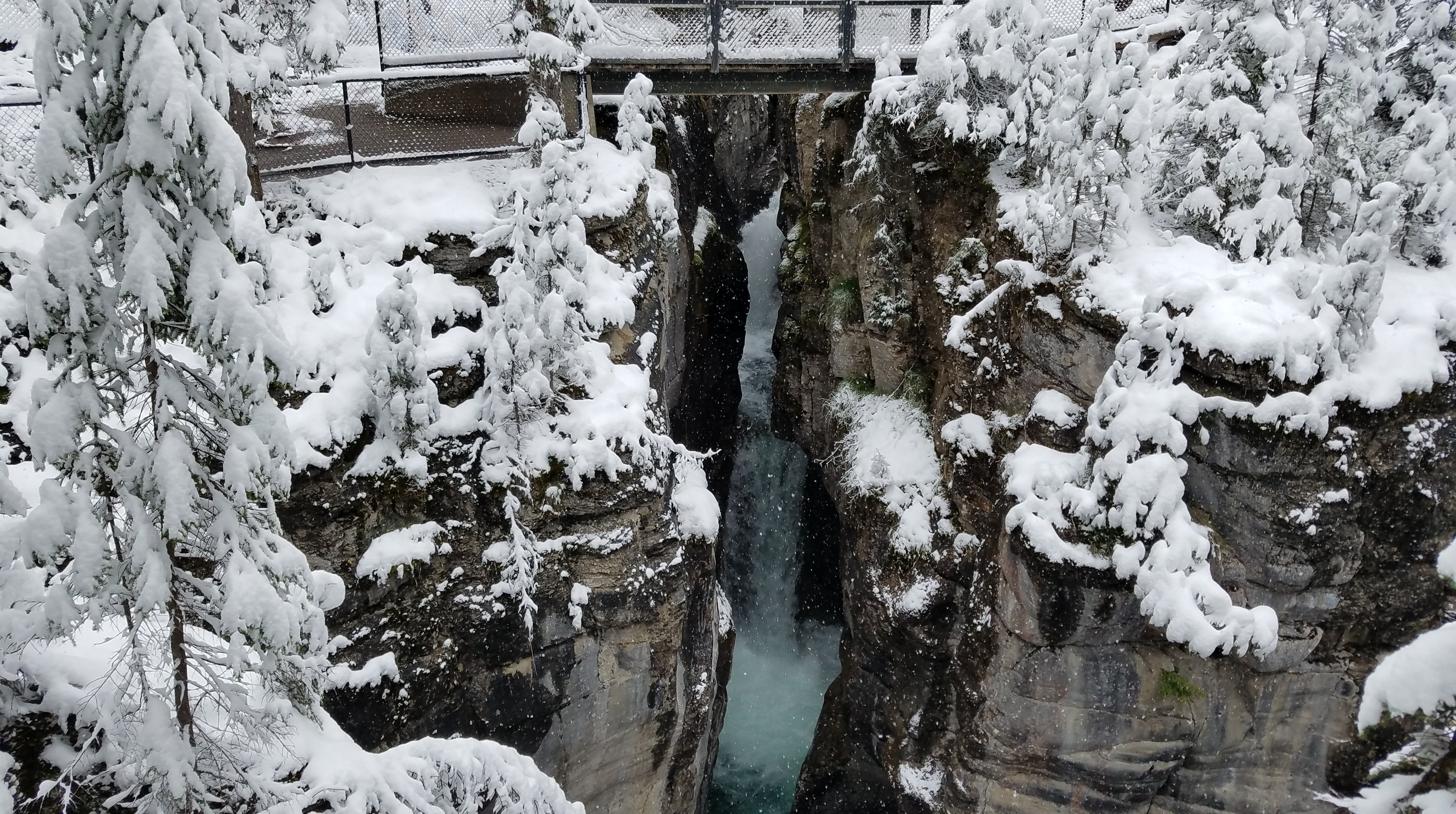 We had a really nice hike up the river toward the Maligne Canyon Visitor Center and Restaurant. We’d recommend doing the hike upstream like we did, as most of the crowds will begin at the large parking lot upstream, just so they don’t have to walk as far to get to the more impressive parts of the canyon. As we made our way along the river, the walls of the canyon started getting taller, and before we knew it, we were crossing bridges over waterfalls that were tumbling almost 160 feet down below us. The snow made for some slippery portions of the walk… especially the portions of the trail that were paved. As we got closer to the restaurant, we ran into more and more people, until we finally made it all the way to First Bridge, and we could see tour busses of people unloading to see the canyon.