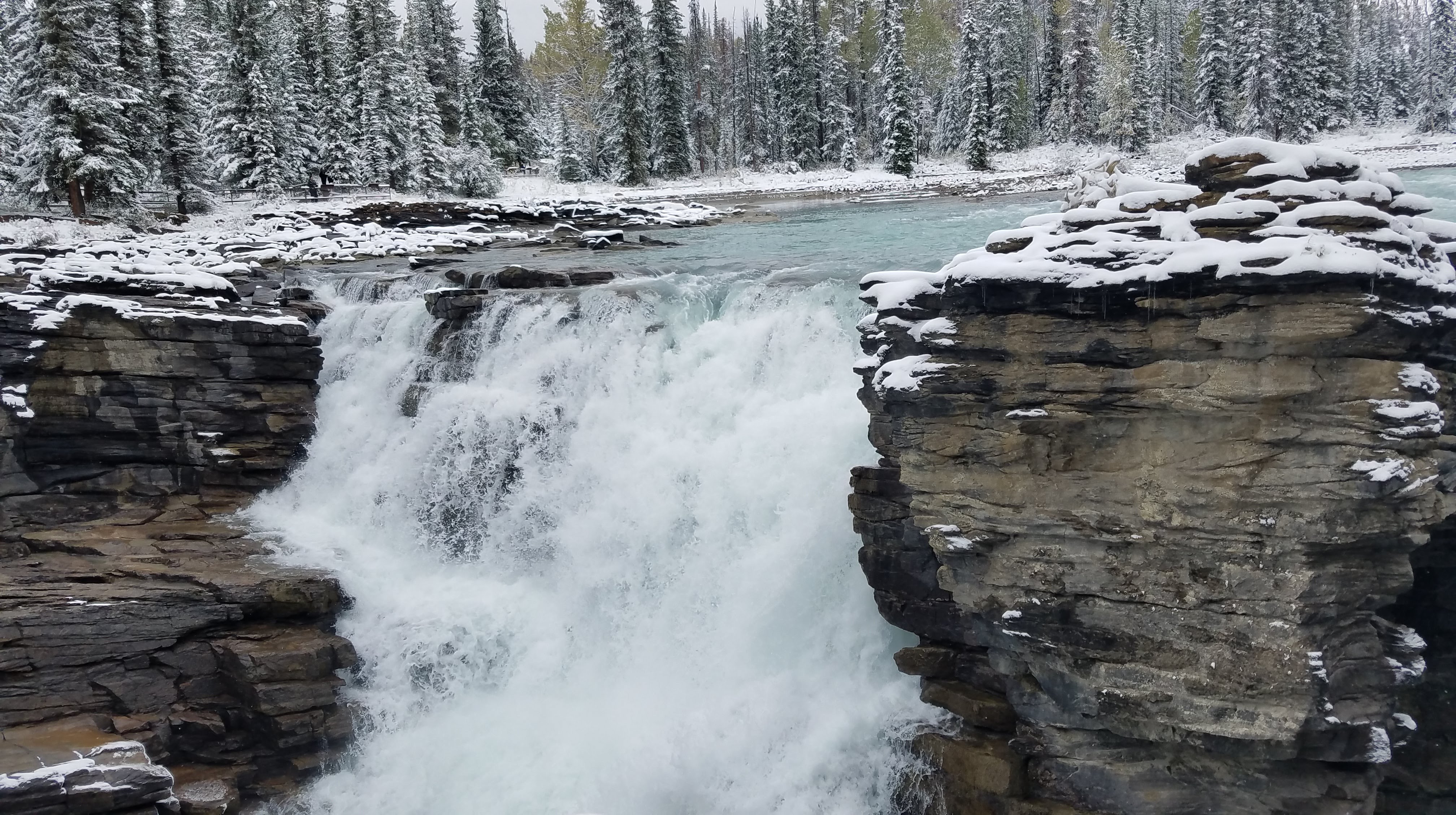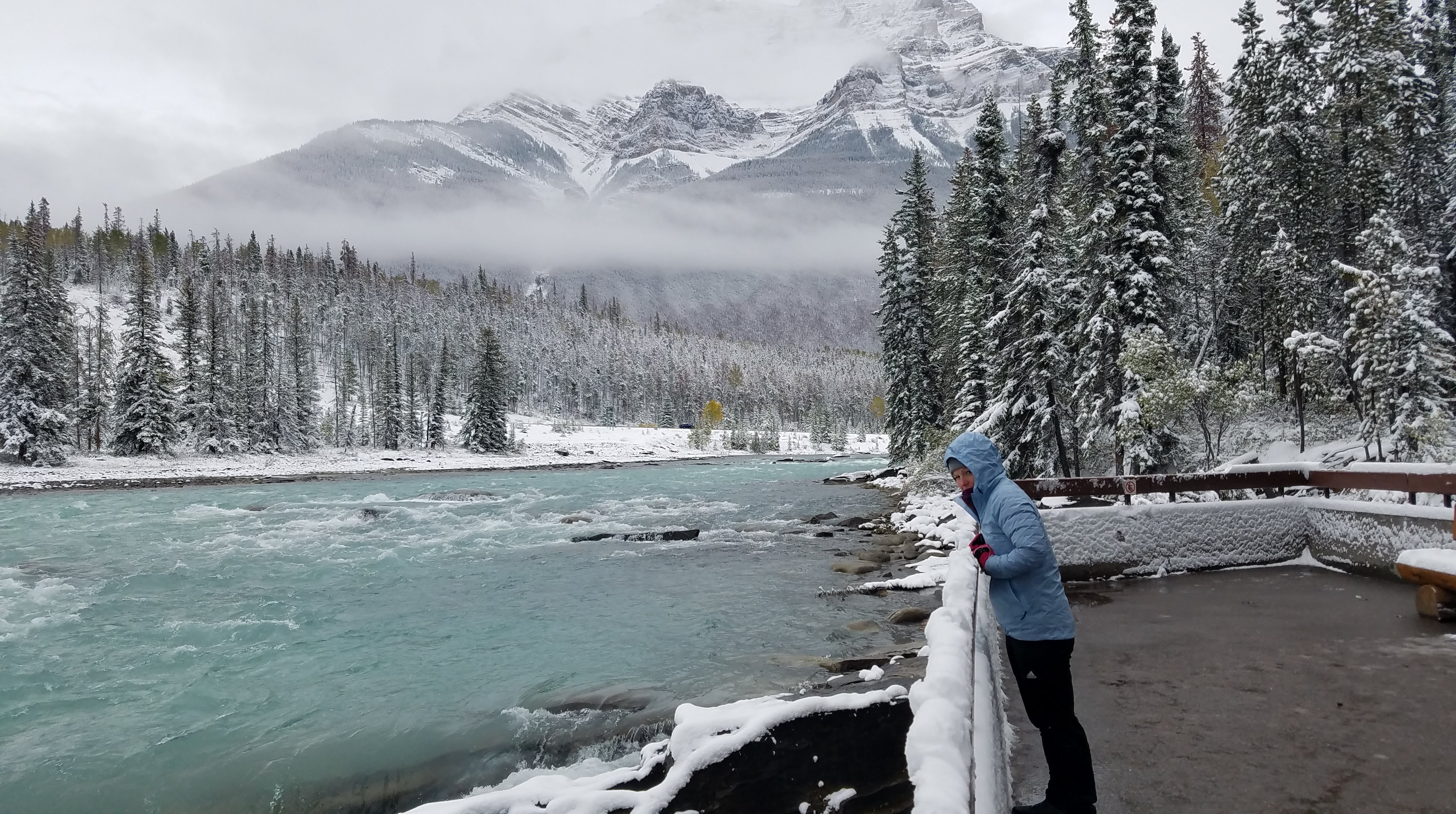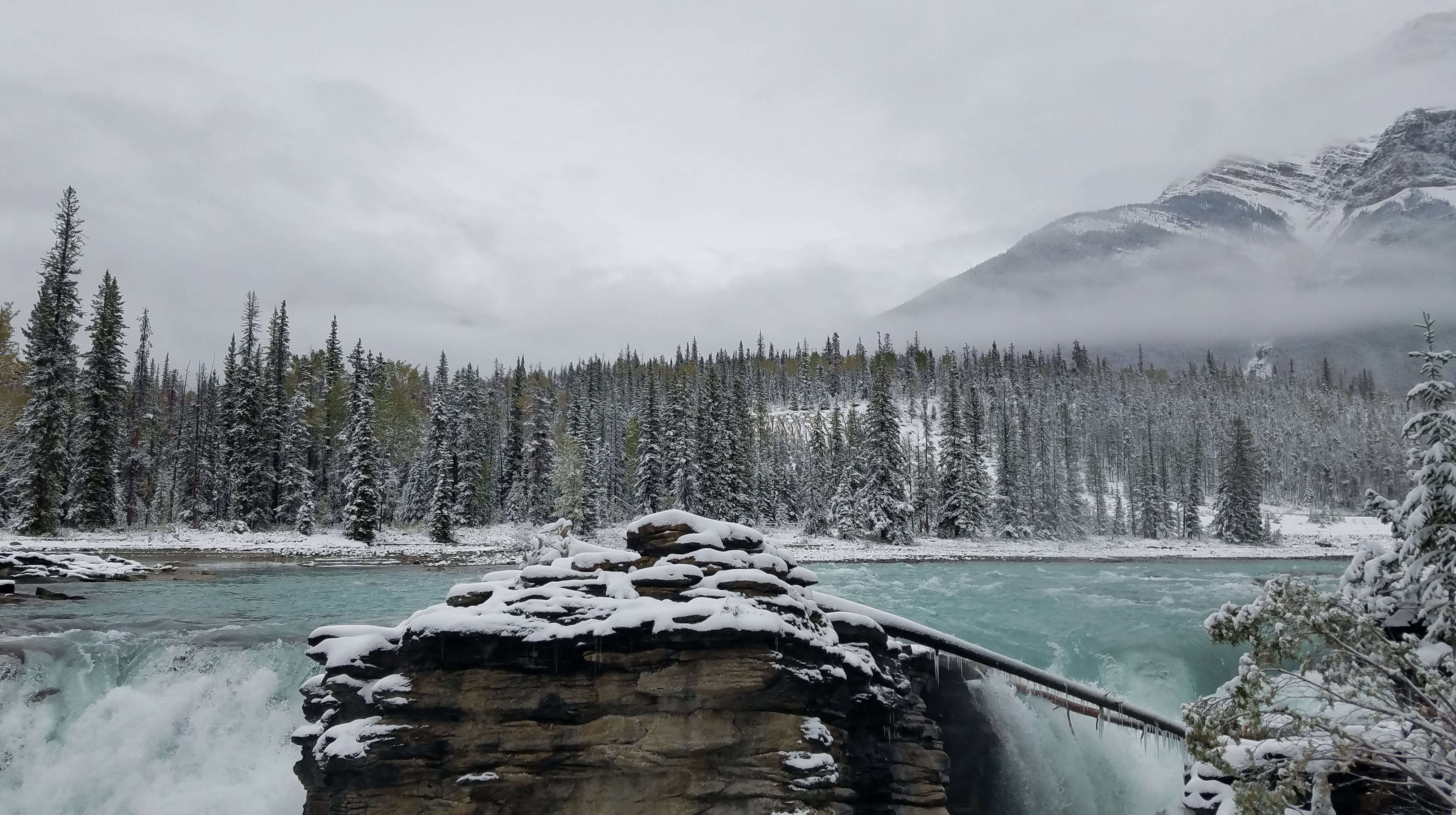 We didn’t need to travel far for our next stop. About 20 miles south of Jasper we stopped at Athabasca Falls. We followed the walkways around the falls, taking in the various views. This is an impressively powerful waterfall, and some of the viewpoints get you so close to the deluge of water. While it was still cloudy and snowing, we could see some shadows of mountains raising above the river. At the bottom of the canyon, through an old crevice that the river had carved out of the rock, we stumbled across a rocky riverbank where people had built rock cairns. They looked especially mysterious all covered in a blanket of snow.