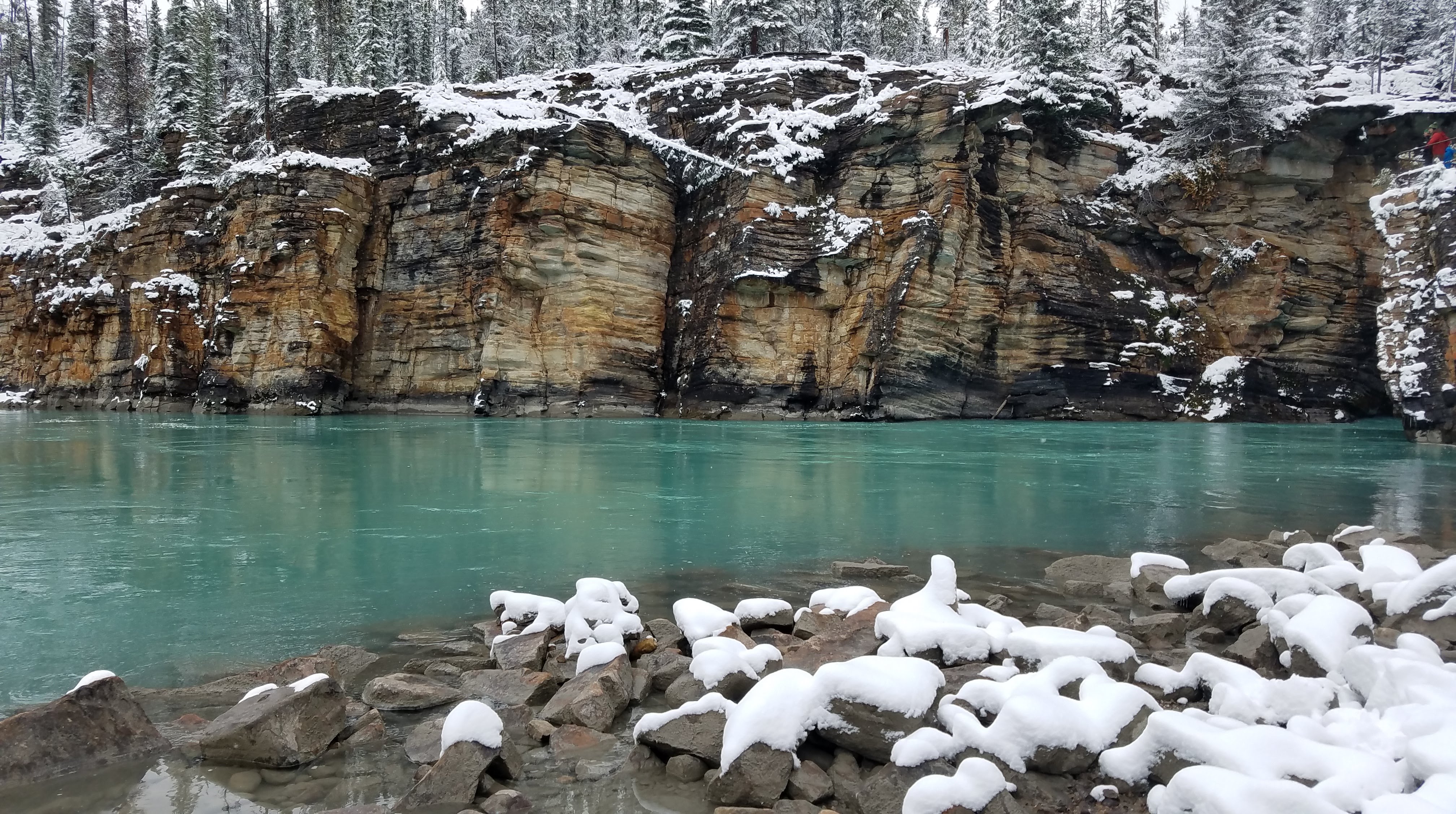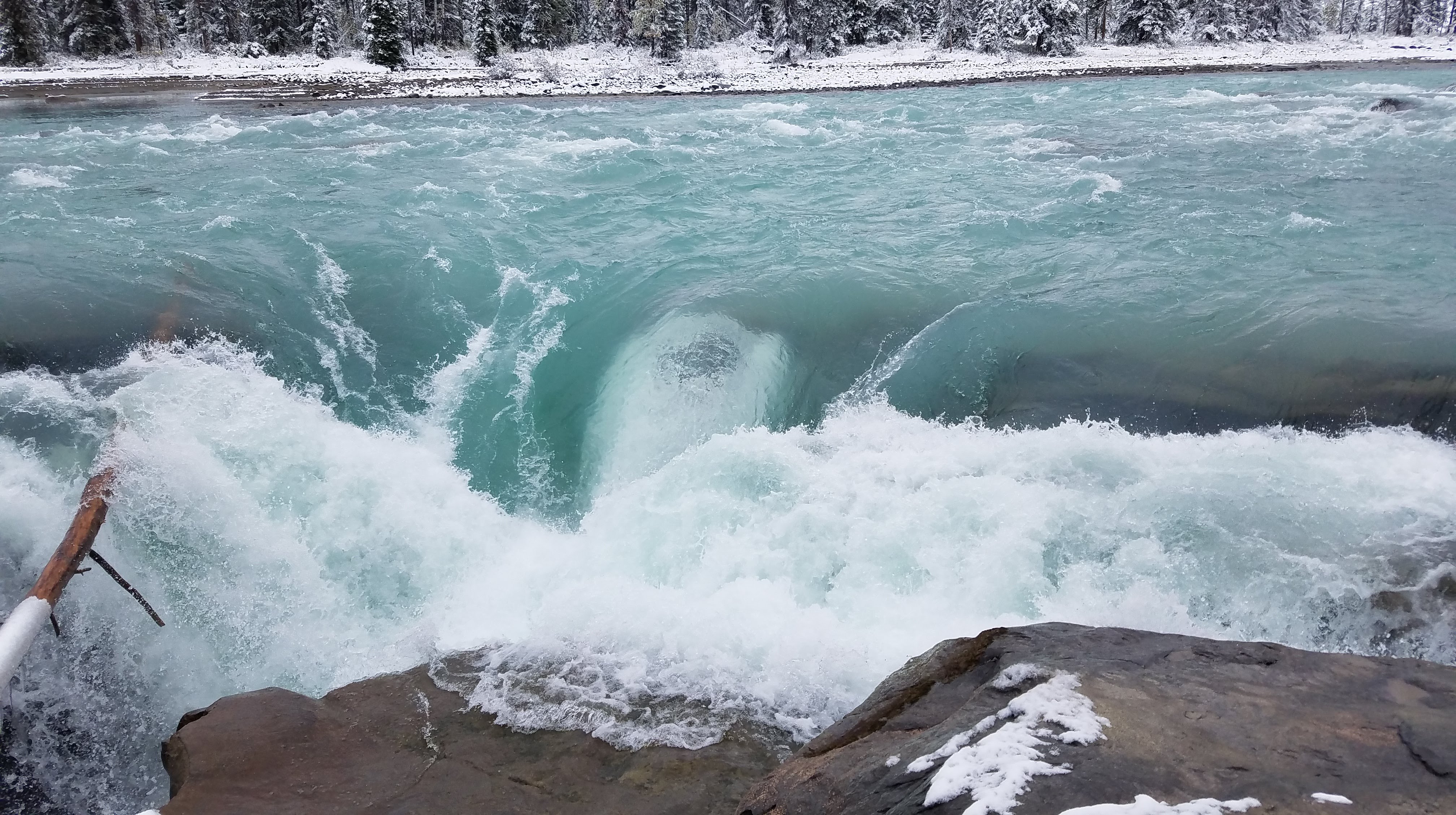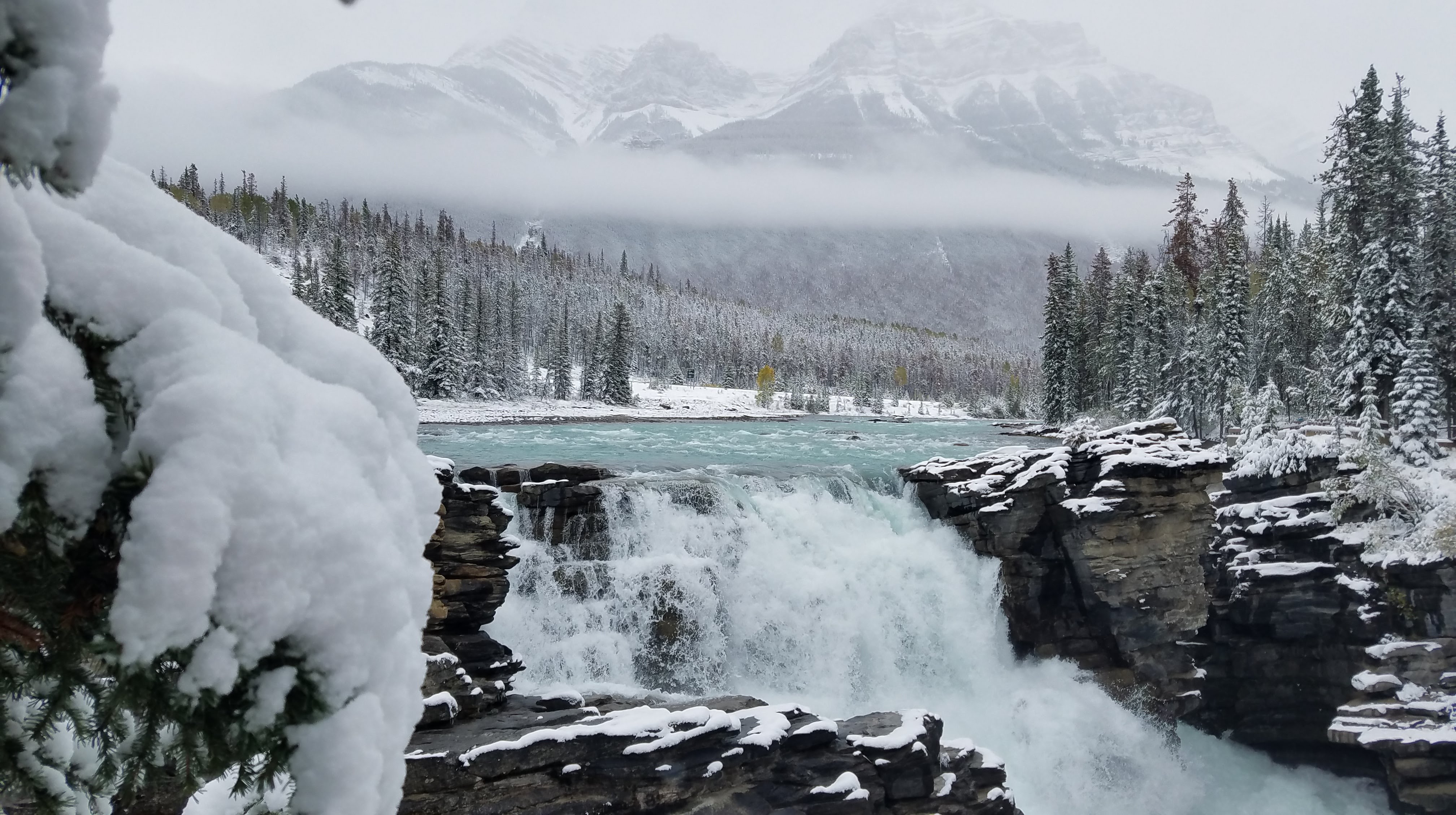 We didn’t need to travel far for our next stop. About 20 miles south of Jasper we stopped at Athabasca Falls. We followed the walkways around the falls, taking in the various views. This is an impressively powerful waterfall, and some of the viewpoints get you so close to the deluge of water. While it was still cloudy and snowing, we could see some shadows of mountains raising above the river. At the bottom of the canyon, through an old crevice that the river had carved out of the rock, we stumbled across a rocky riverbank where people had built rock cairns. They looked especially mysterious all covered in a blanket of snow.
