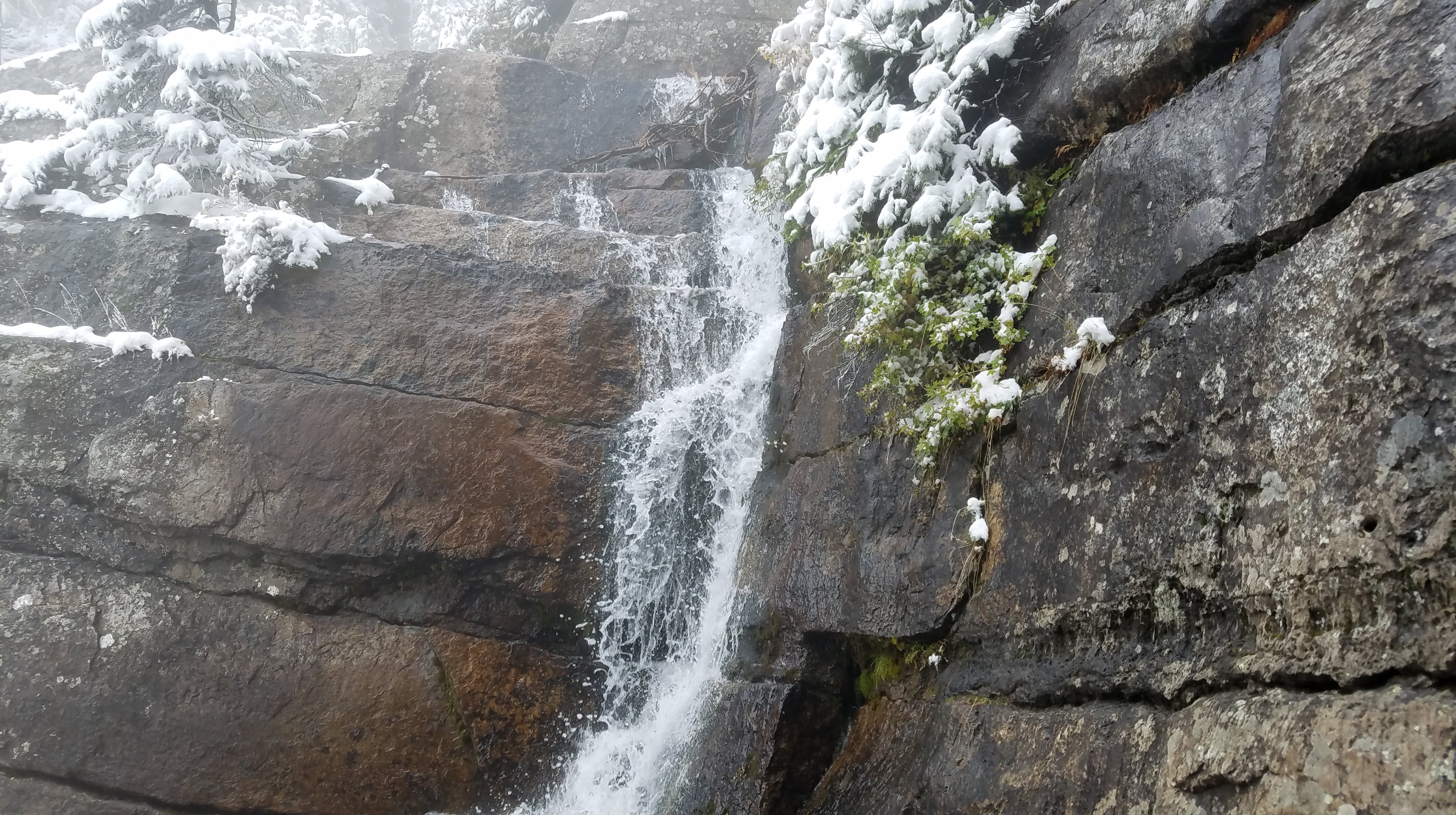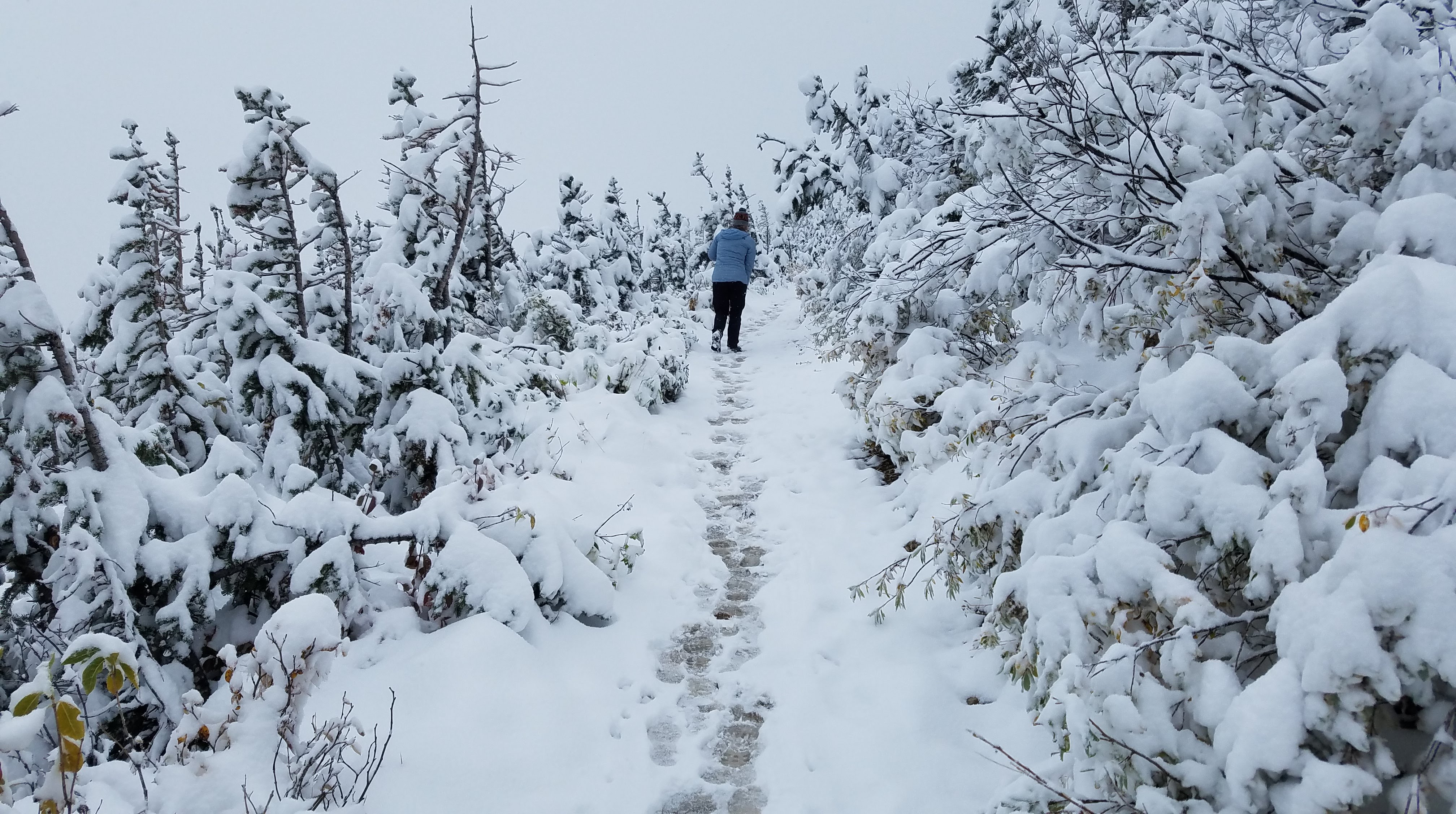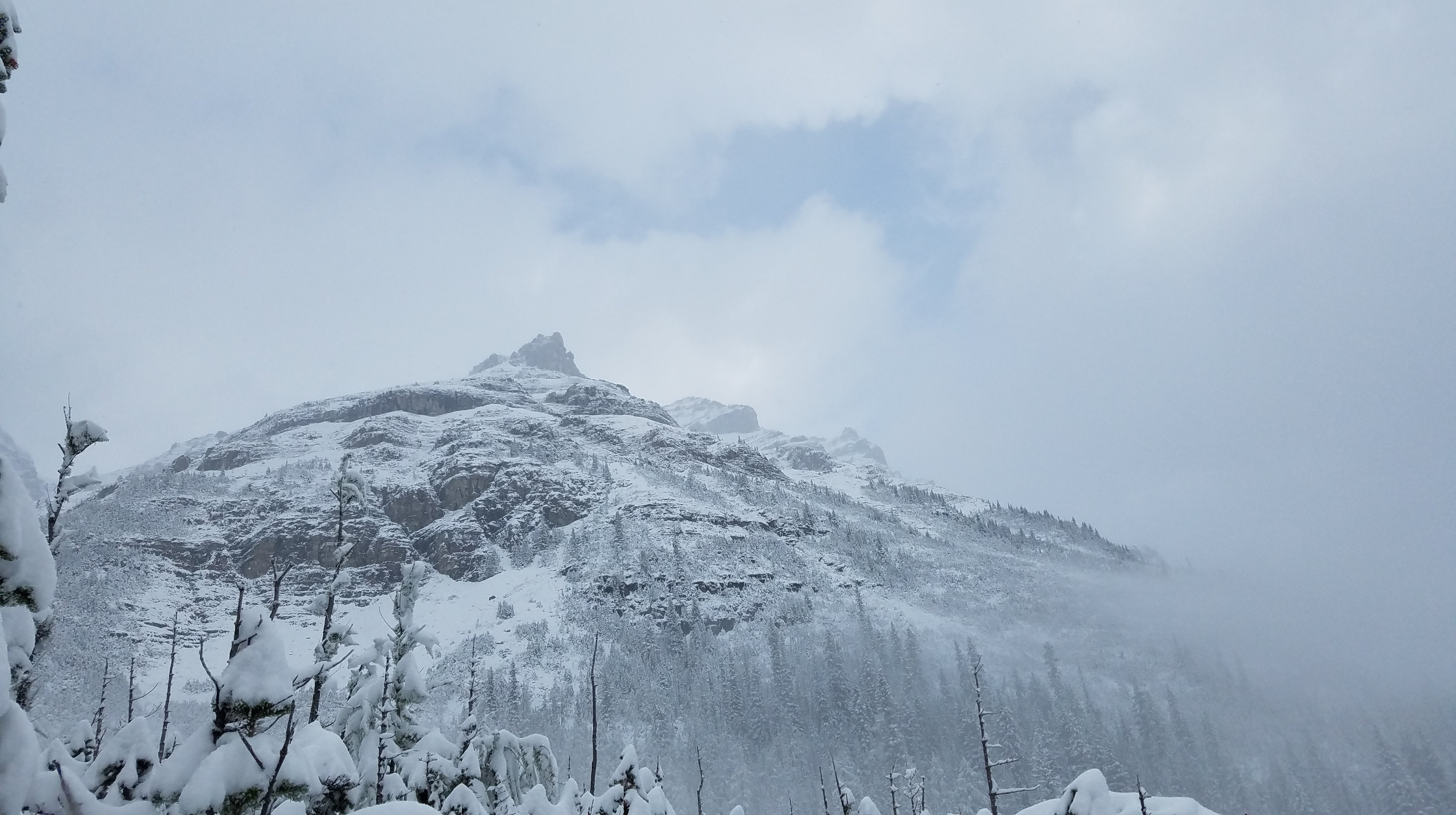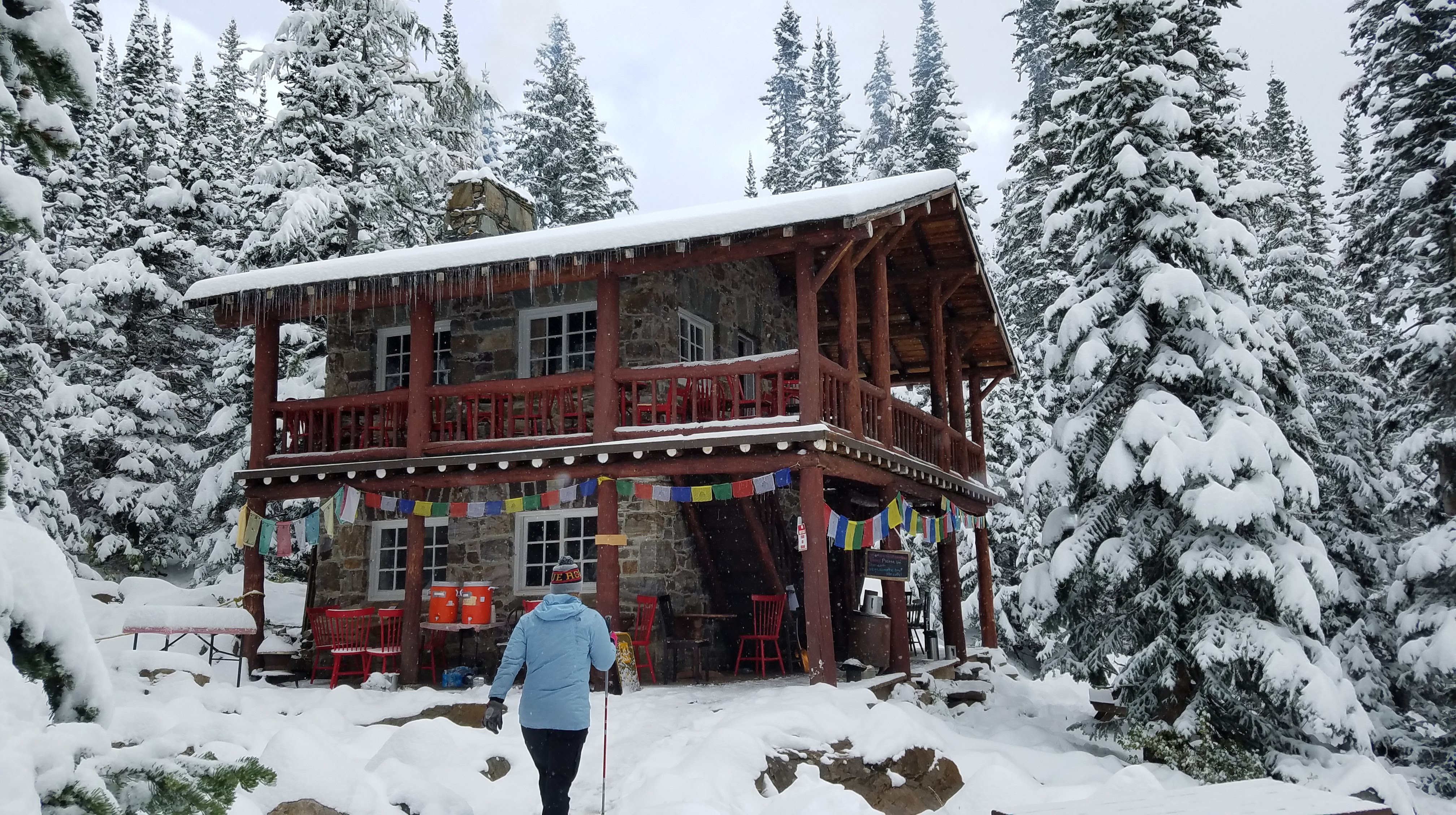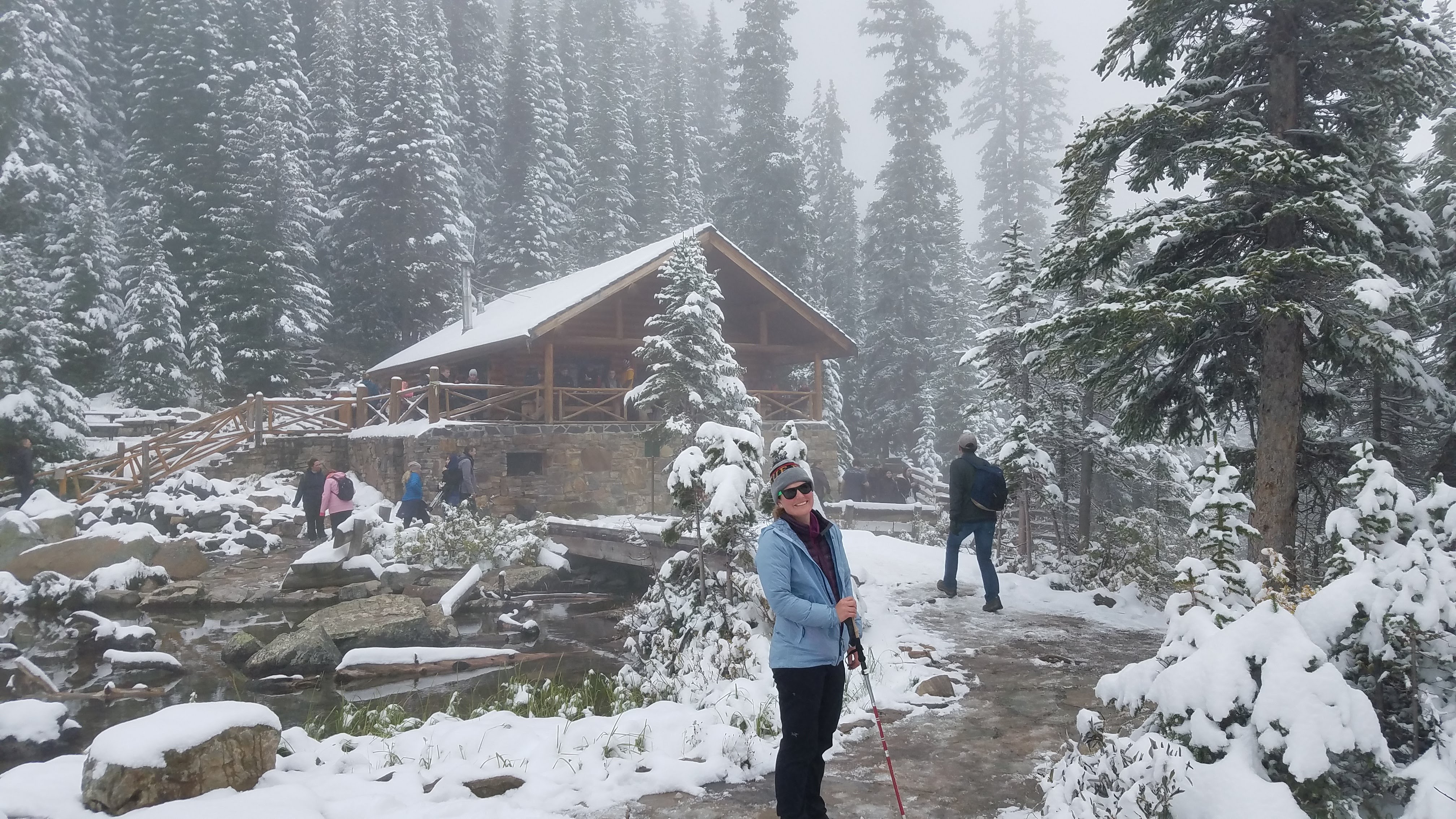 After the first tea house, some of the clouds started lifting, giving us views of the rocky peaks above us, and a glimpse of blue sky… but still no views below to the lake. As we headed toward the Lake Agnes Teahouse, we started passing more and more people. The Lake Agnes Teahouse is actually at a higher elevation than the Plain of Six Glaciers Tea House… and there were some steep stairs at the end of that walk which made that fact abundantly clear. We had to be careful as well, because with the snow plus the pressure of hundreds of feet, the steps and much of the trail had been compressed to ice.