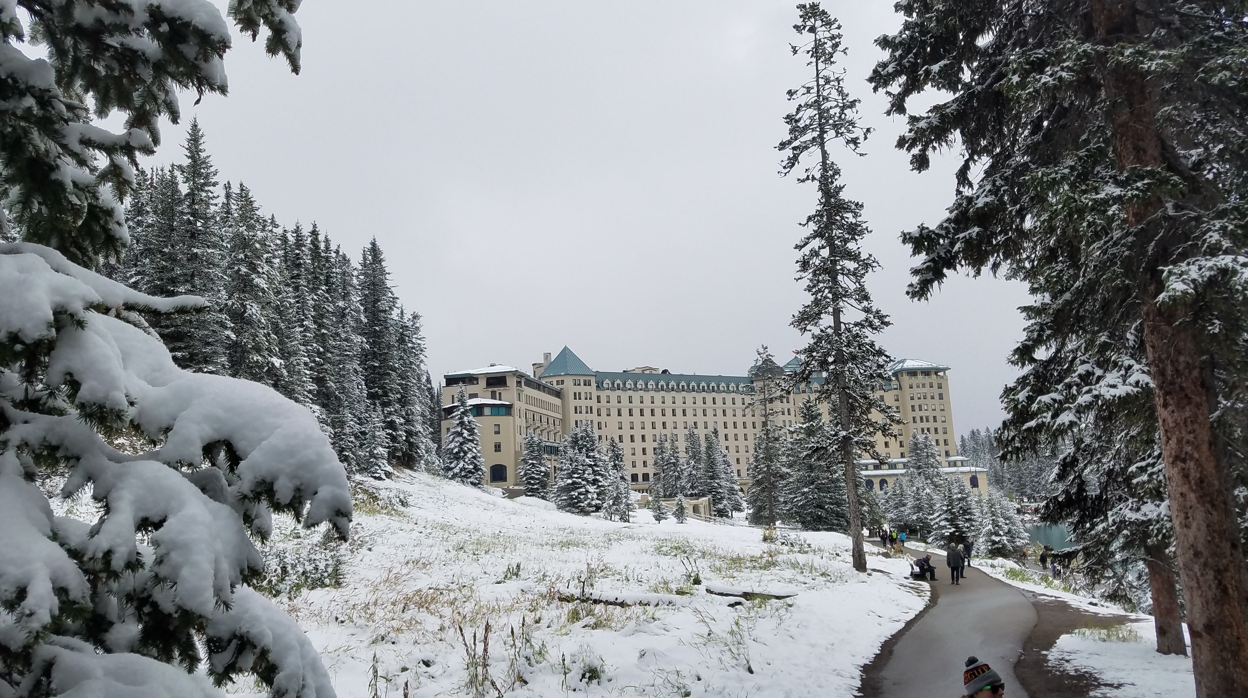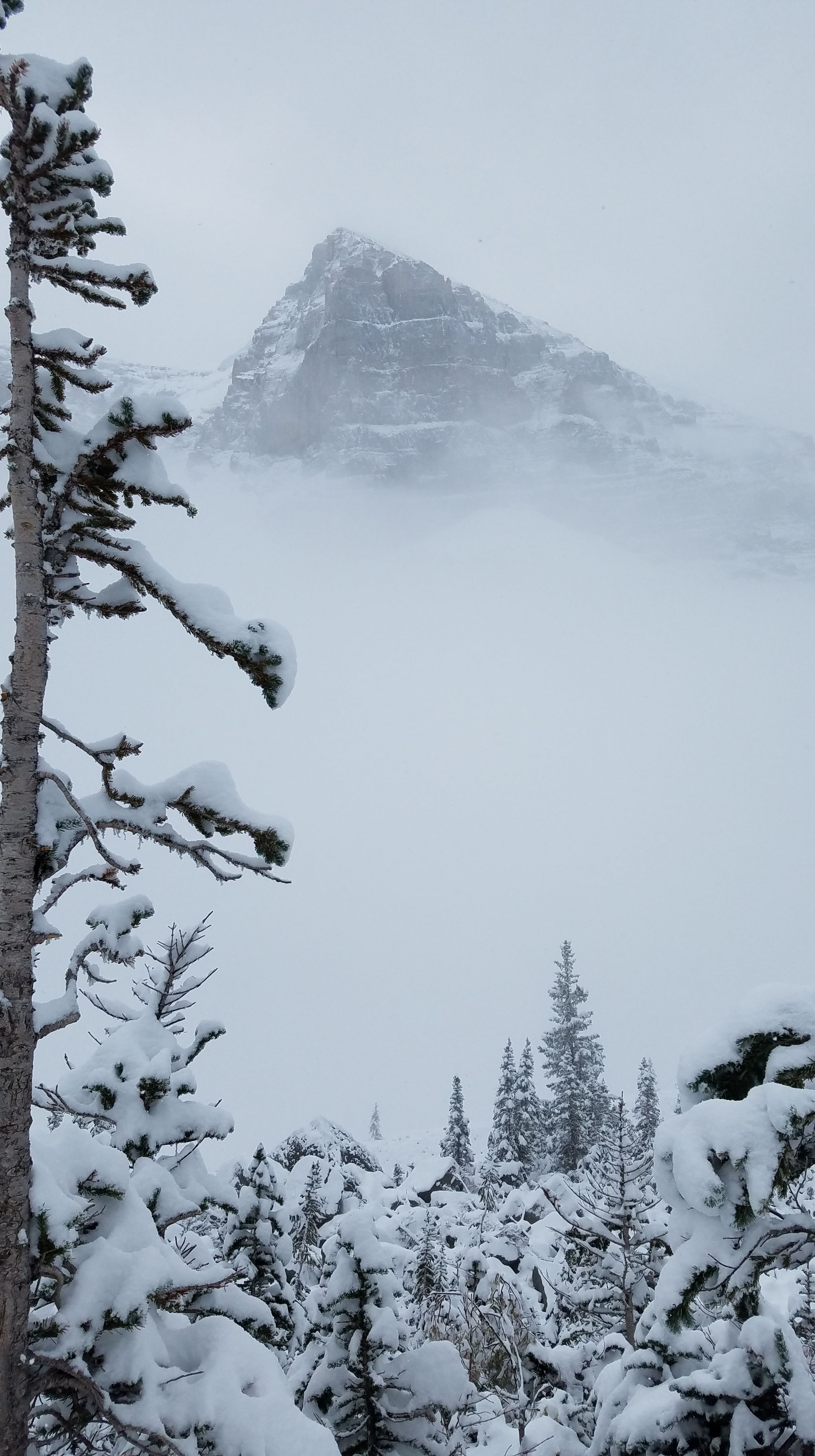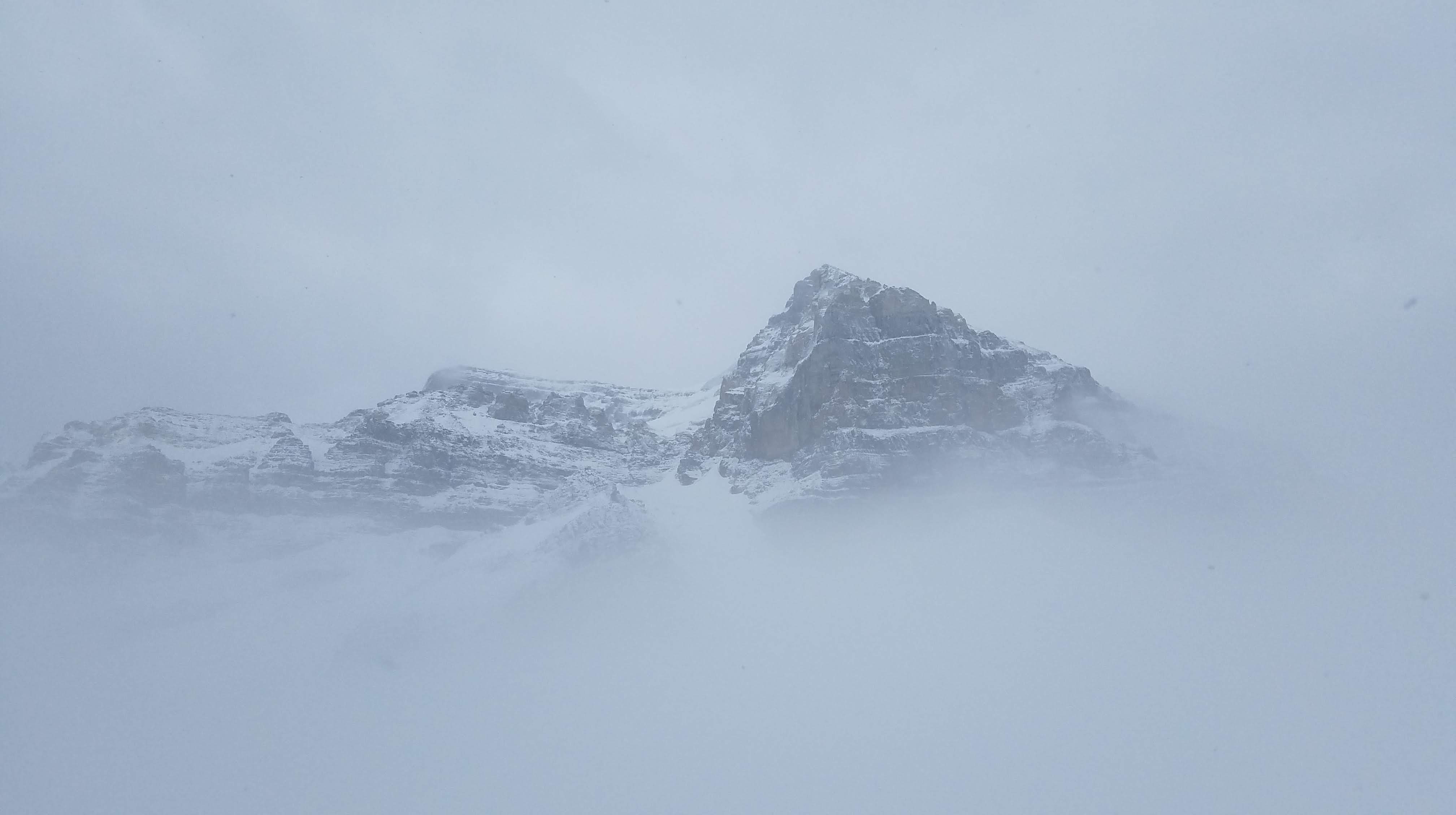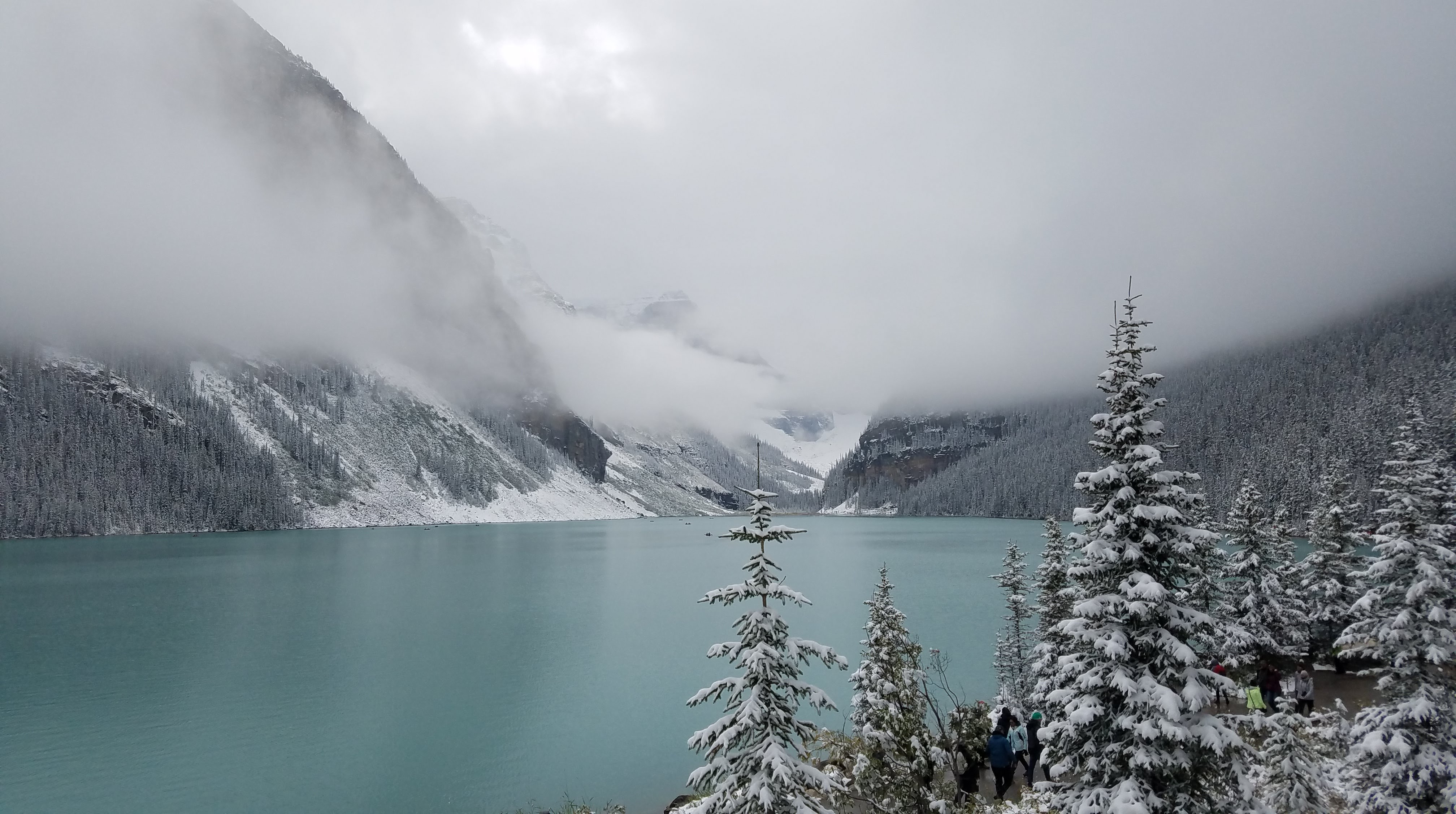 We had another early morning start out of the Crossing Resort… we wanted to make sure we beat the crowds down to Lake Louise. We had about an hour drive south to the parking lot. We showed up around 8:00 in the morning, which was apparently early enough to park in the lower lot. As the day goes on and the lots fill up, people do end up needing to park off-site and get shuttled in. On the eastern shore of Lake Louise stands the Fairmont Chateau… a towering, elegant buildingĀ which overlooks the alpine lake, across to the peaks and glaciers. Unfortunately it was another foggy, snowy morning, so the normally majestic mountains that surround the lake were completely hidden.