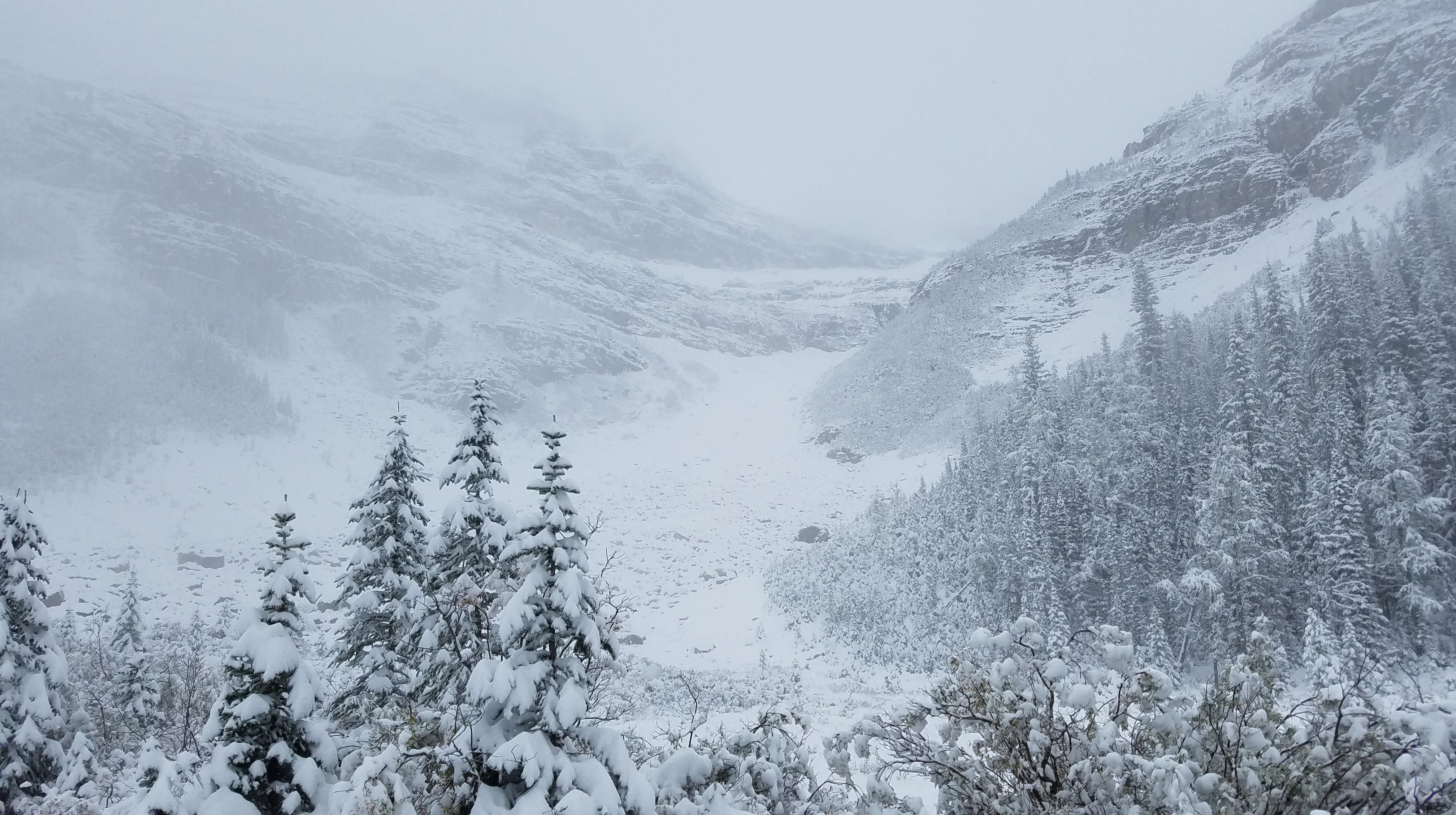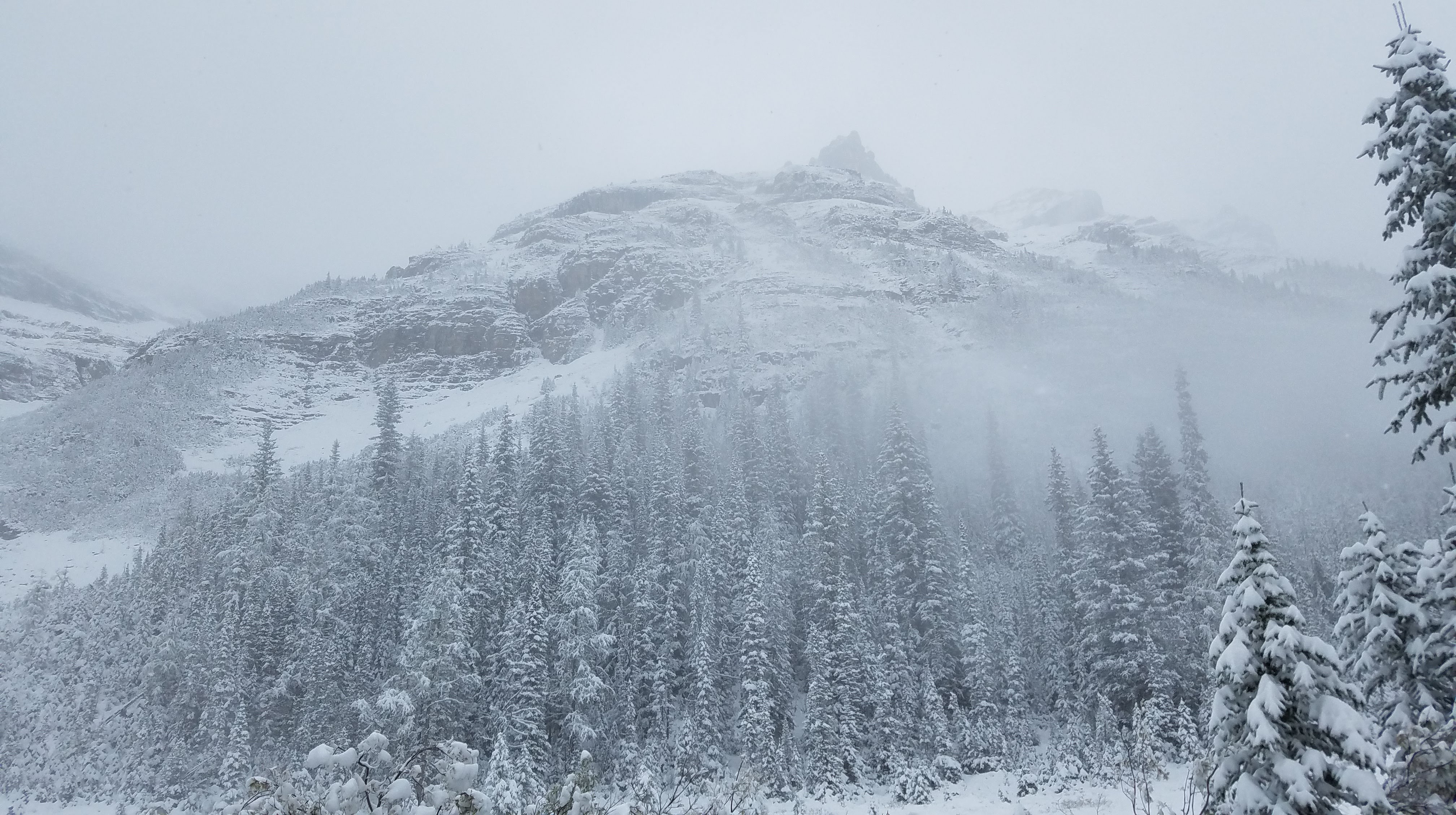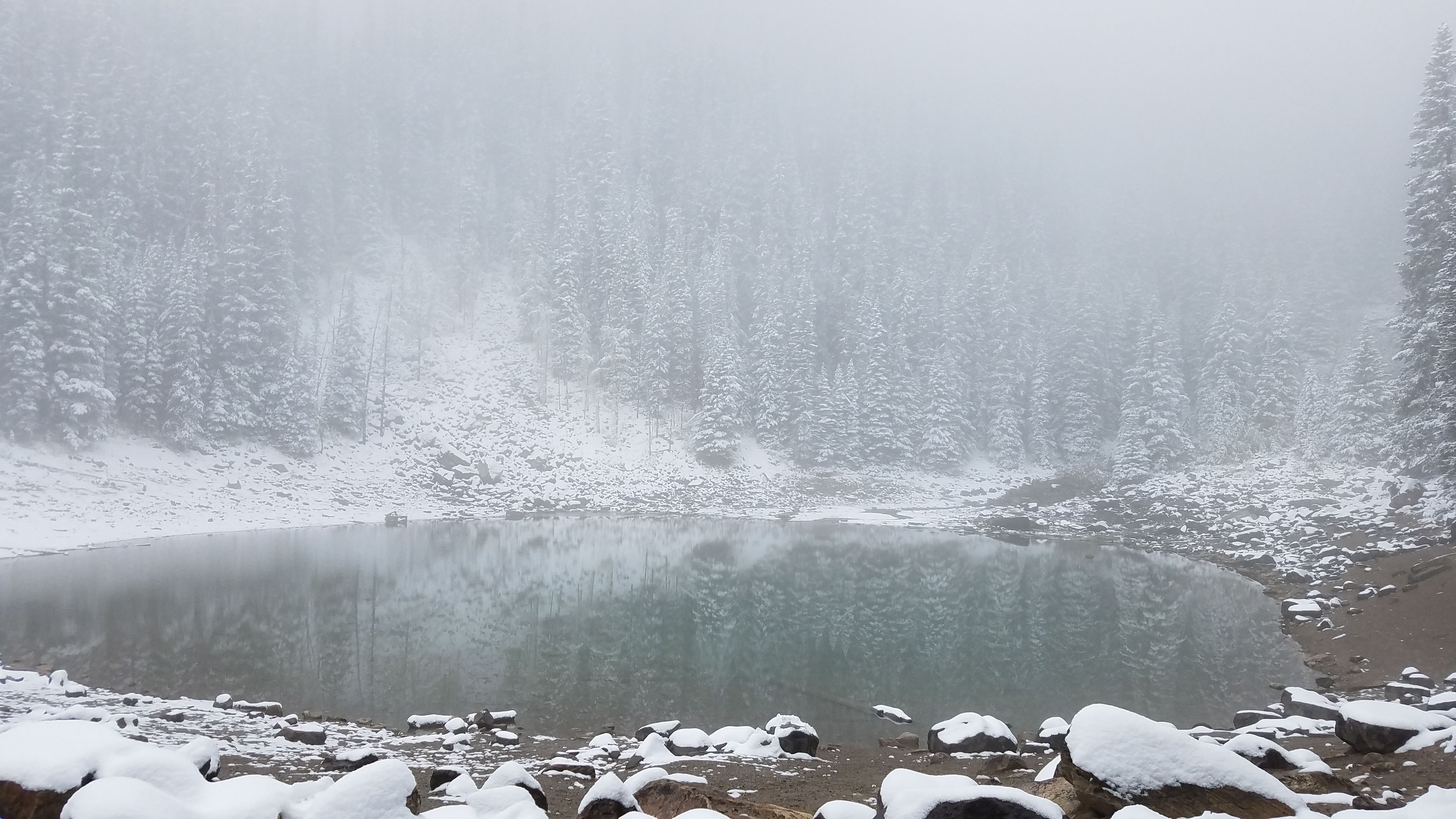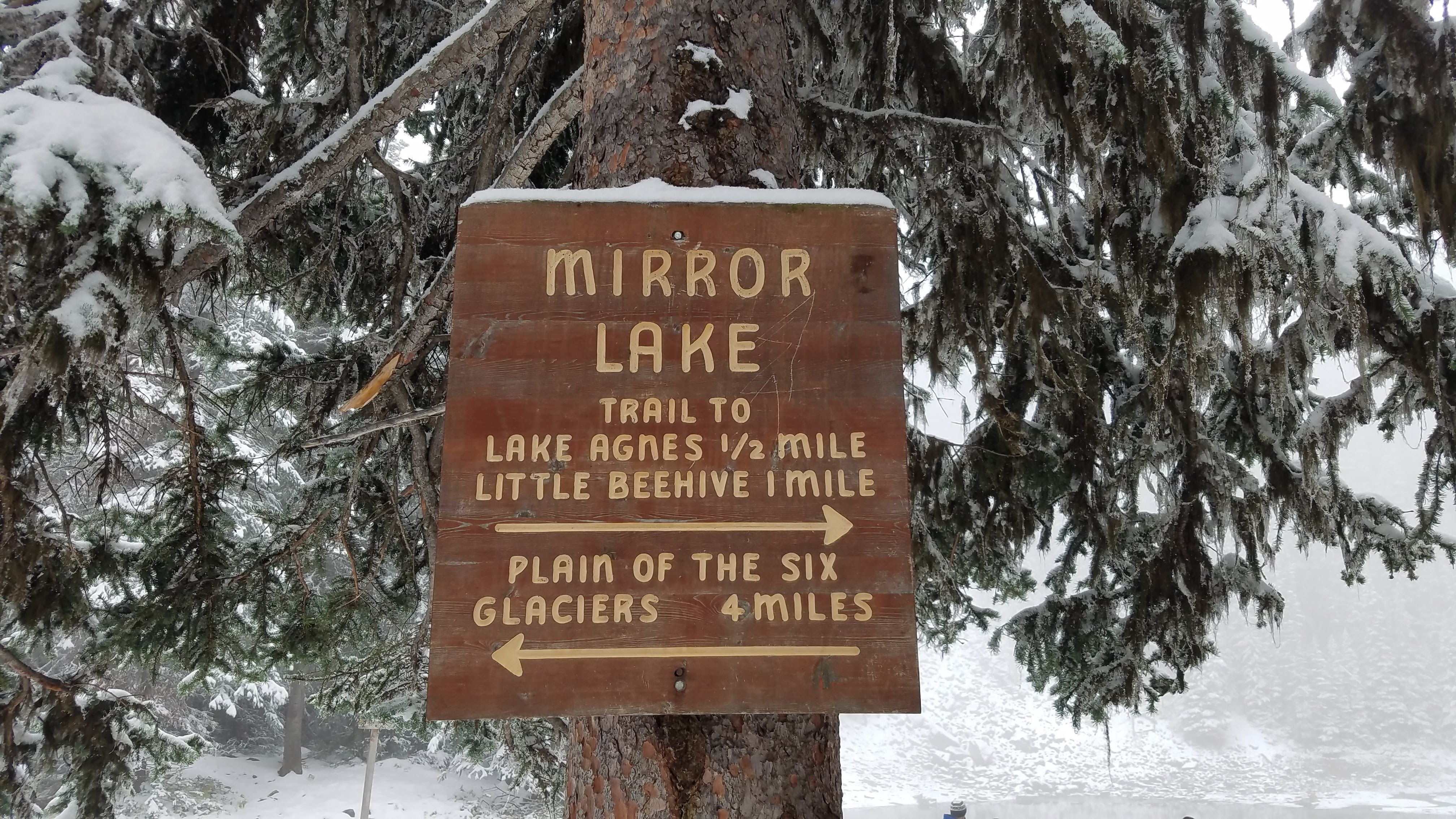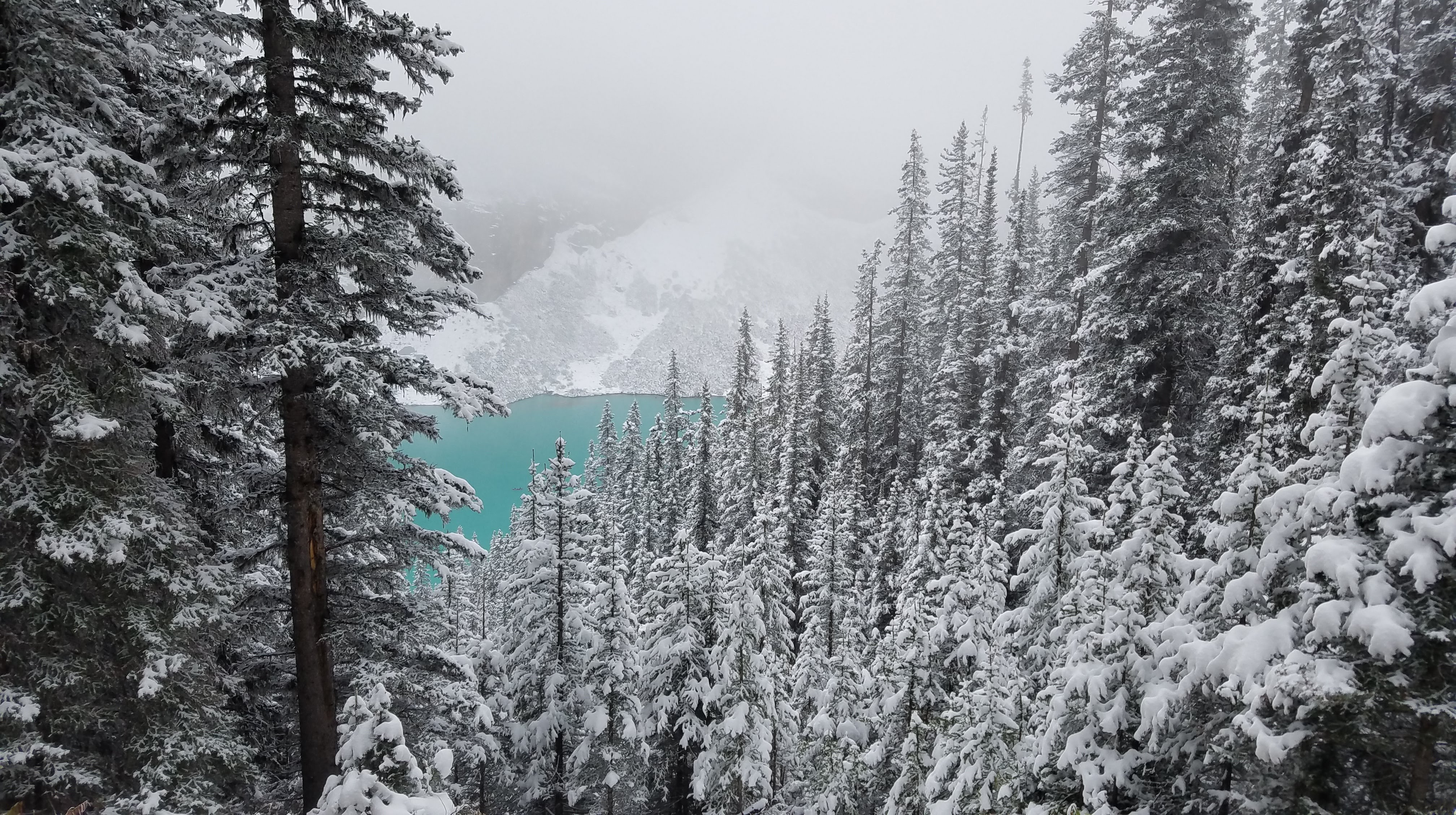We had another early morning start out of the Crossing Resort… we wanted to make sure we beat the crowds down to Lake Louise. We had about an hour drive south to the parking lot. We showed up around 8:00 in the morning, which was apparently early enough to park in the lower lot. As the day goes on and the lots fill up, people do end up needing to park off-site and get shuttled in. On the eastern shore of Lake Louise stands the Fairmont Chateau… a towering, elegant buildingĀ which overlooks the alpine lake, across to the peaks and glaciers. Unfortunately it was another foggy, snowy morning, so the normally majestic mountains that surround the lake were completely hidden.
