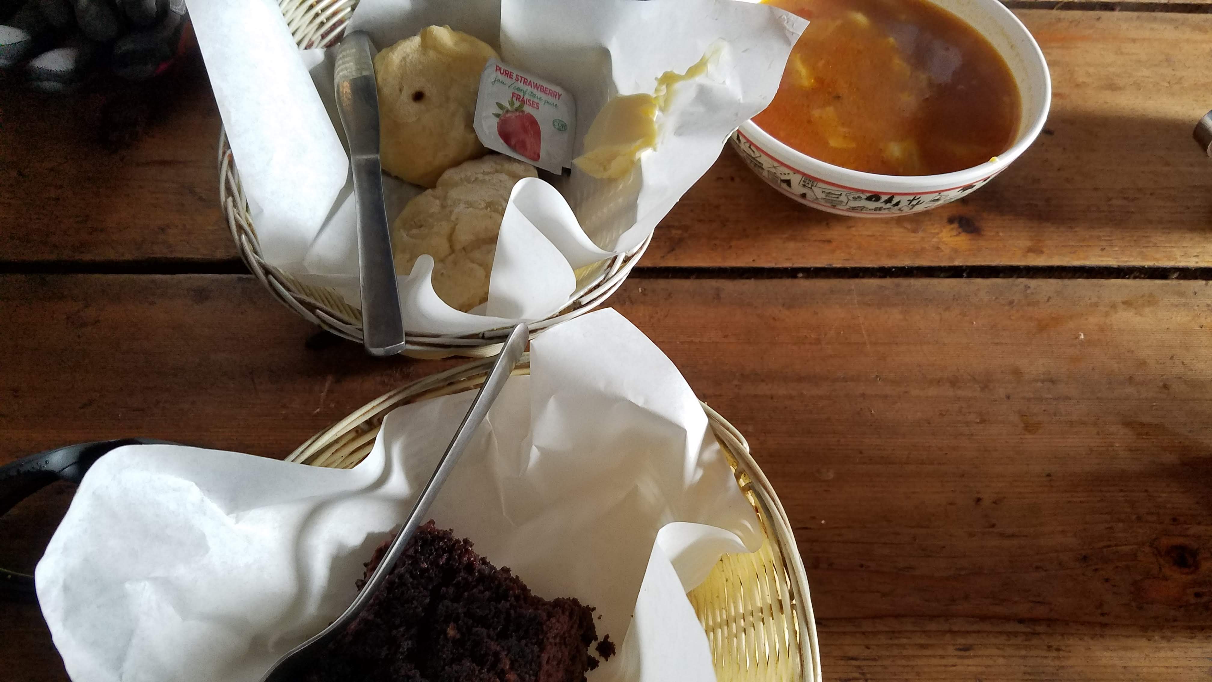 The most difficult part of the first half of this hike was after we passed the Plain of Six Glaciers teahouse and continued up towards the actual glacier… we were apparently the first to use that trail for the day, so we were blazing the trail through shin-deep snow. We ultimately reached a point where we weren’t sure if the trail ended or continued… so we decided it was the end, and turned back to the teahouse for some warm tea, a bowl of soup, and a huge slice of chocolate cake that they make right there, up on the mountain.