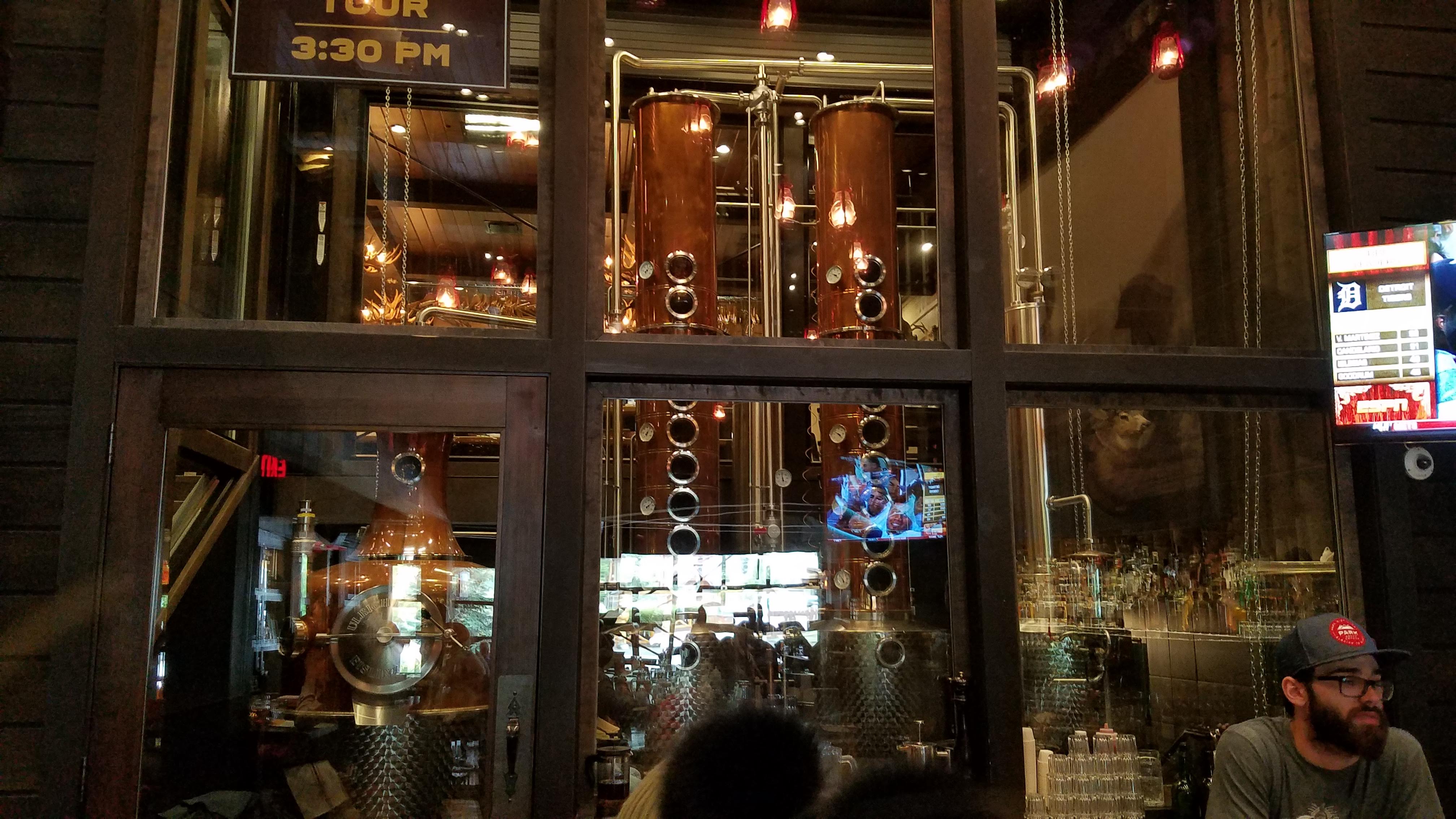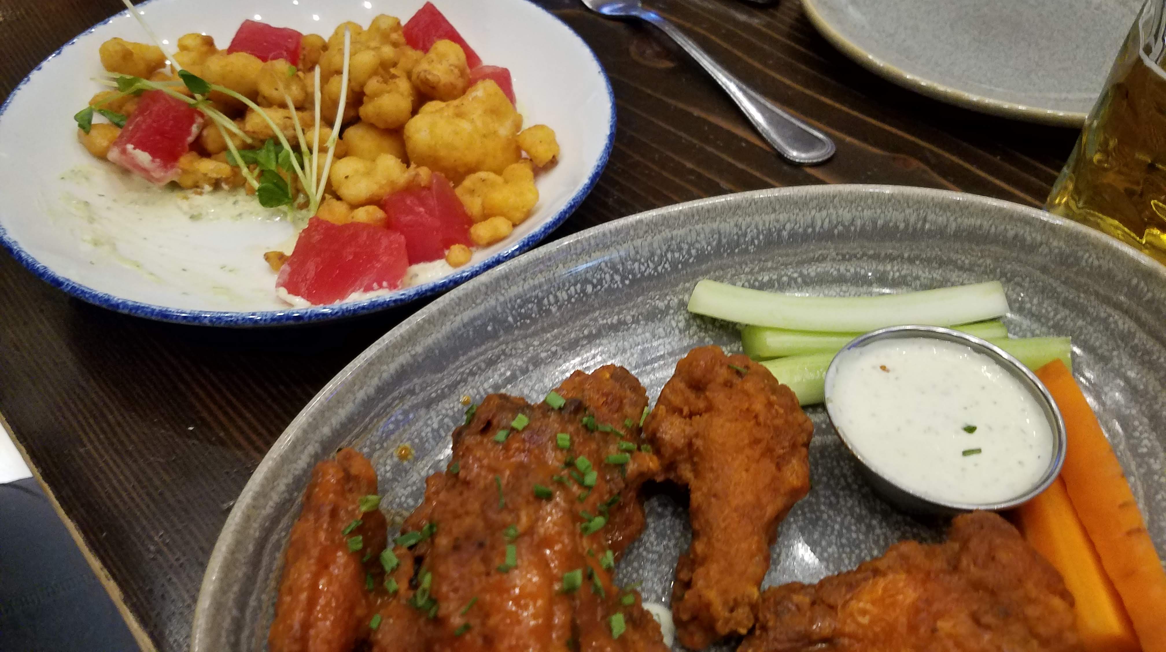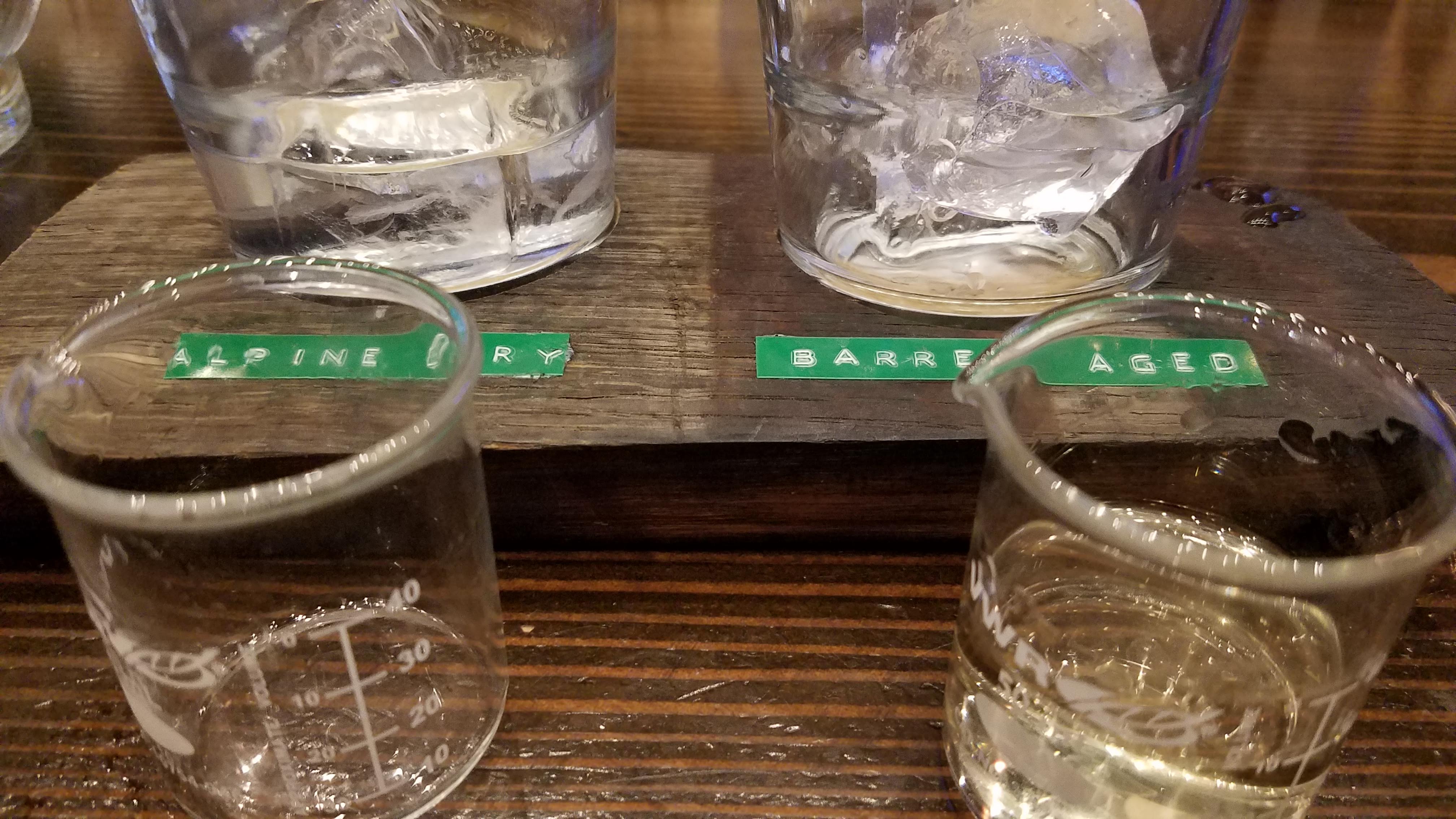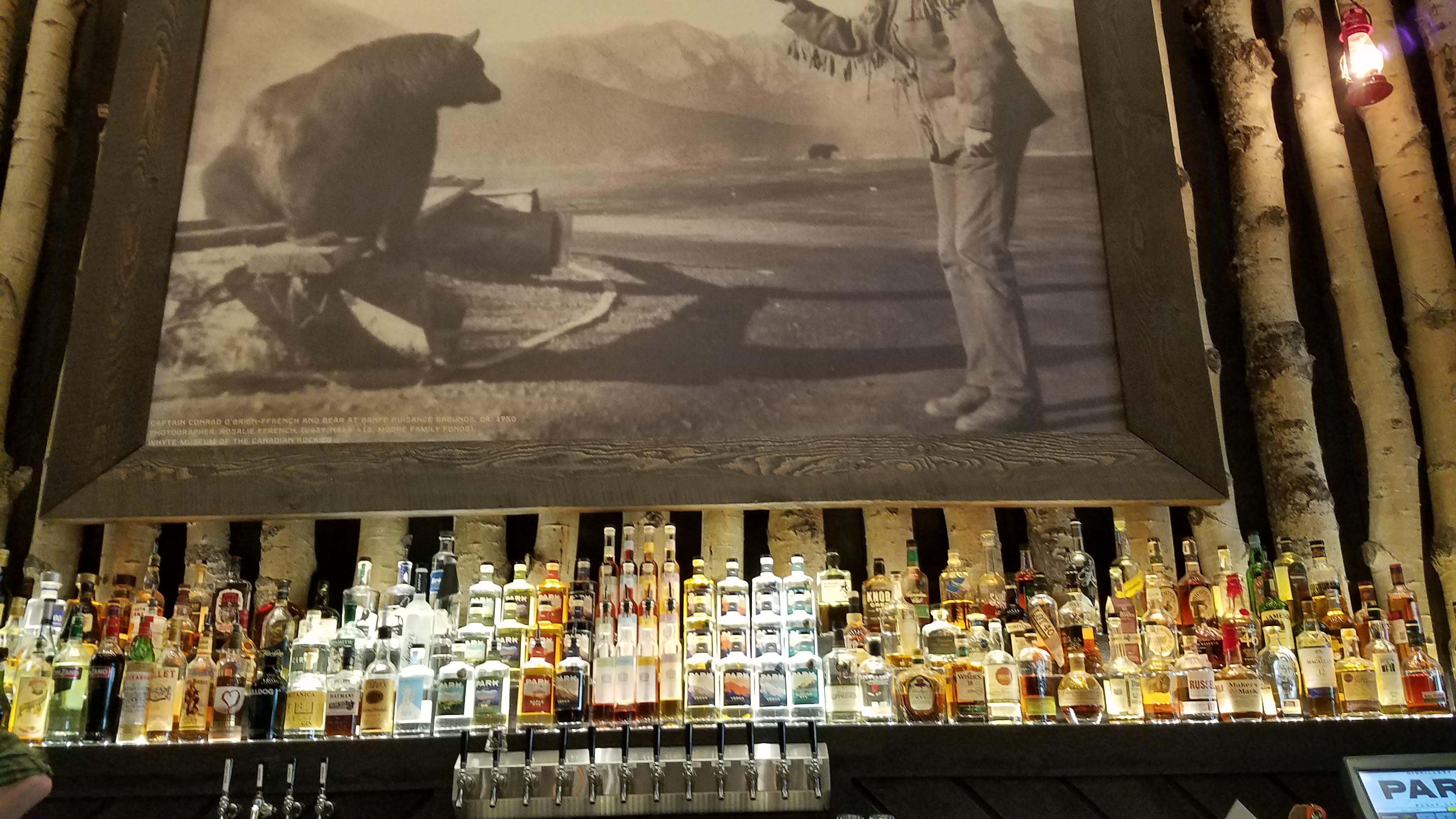 Our choice for lunch was Park Distillery Restaurant and Bar, situated right in the middle of downtown Banff. We hit them at a fairly quiet time… right between lunch and dinner, so we were able to grab a couple spots at the bar and got served fairly quickly. We went with a few appetizers as well as a couple of Alberta beers to start with. This is one of the things we like to do when we only have a few hours, or a single day in a town… just order smaller, shareable plates for food. This gives us the opportunity to visit a couple of restaurants instead of just eating one large meal at one. After the wings and fried cauliflower (which were both very good) I ordered the house Gin sampler, which had two samples of their house-made Gin. One was their normal Park Alpine Dry Gin, which is created in the style of a traditional london dry, but includes hand-picked Canadian Spruce tips, which add a really nice, resinous aroma and flavor. The other was the same gin, only aged for 6 months in bourbon barrels, which really mellows out the harsher herbal notes, and leaves a nice oaky finish, with a little bit of that vanilla sweetness. A very interesting take on gin.